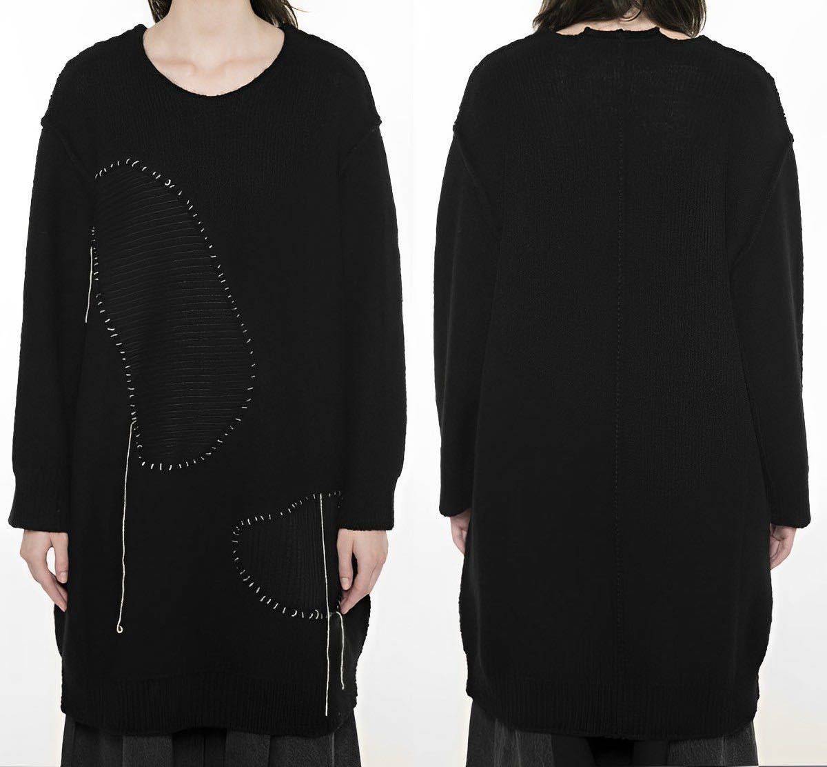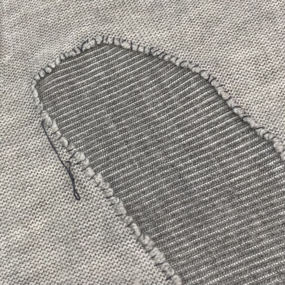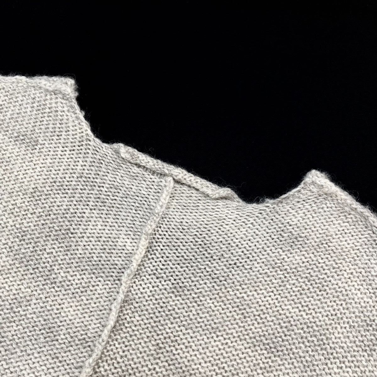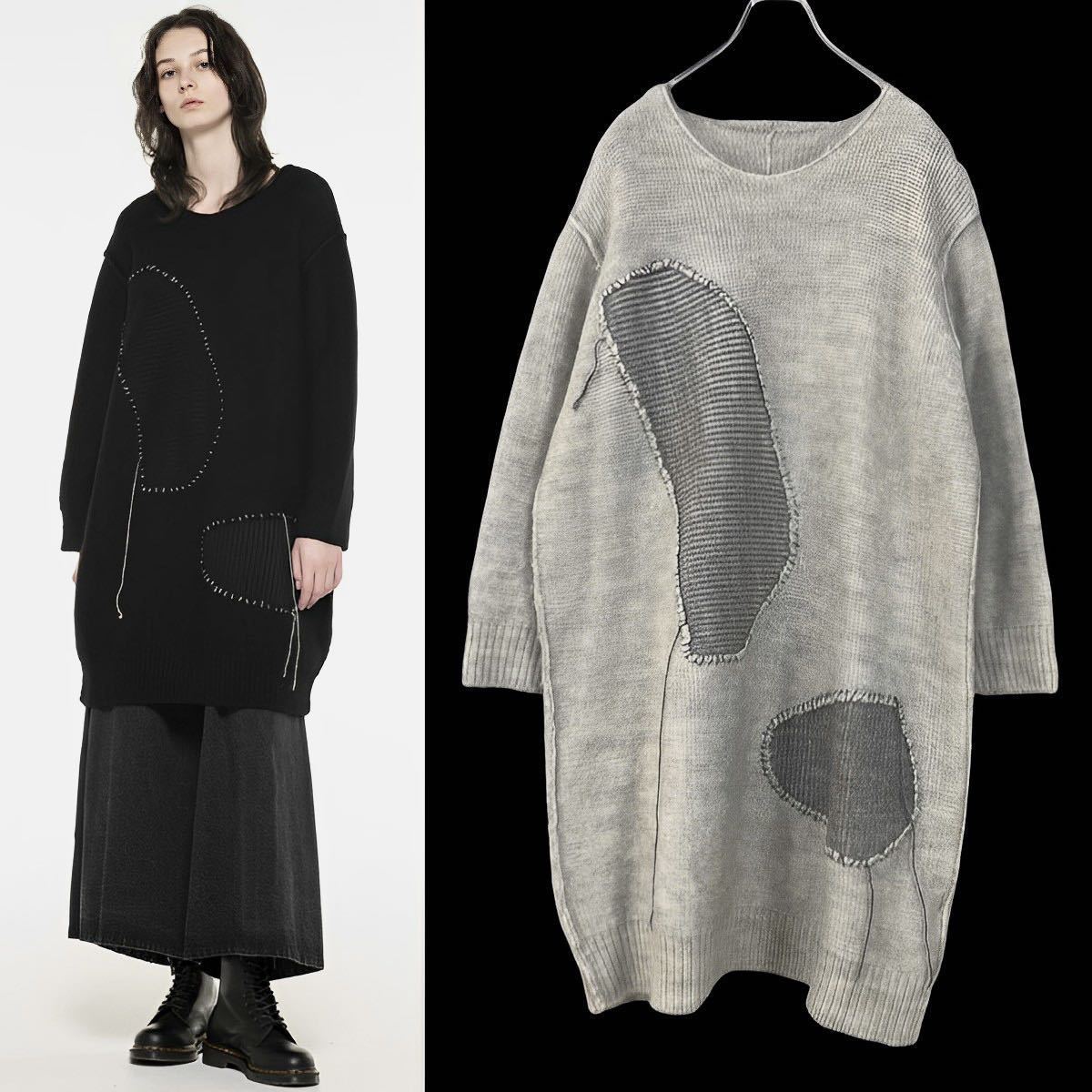成型編みした身頃にハサミで大胆に穴を開け、裏から別布をあてがいひと針ひと針ハンドステッチでざっくりとかがった味のあるプルオーバーニット。穴部分の別布と温かみのあるハンドステッチが美しく融合したニットは、裁ち切りの襟元がワイズらしいラフな印象で1枚でも様になるアイテムです。