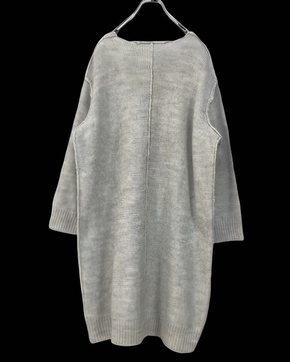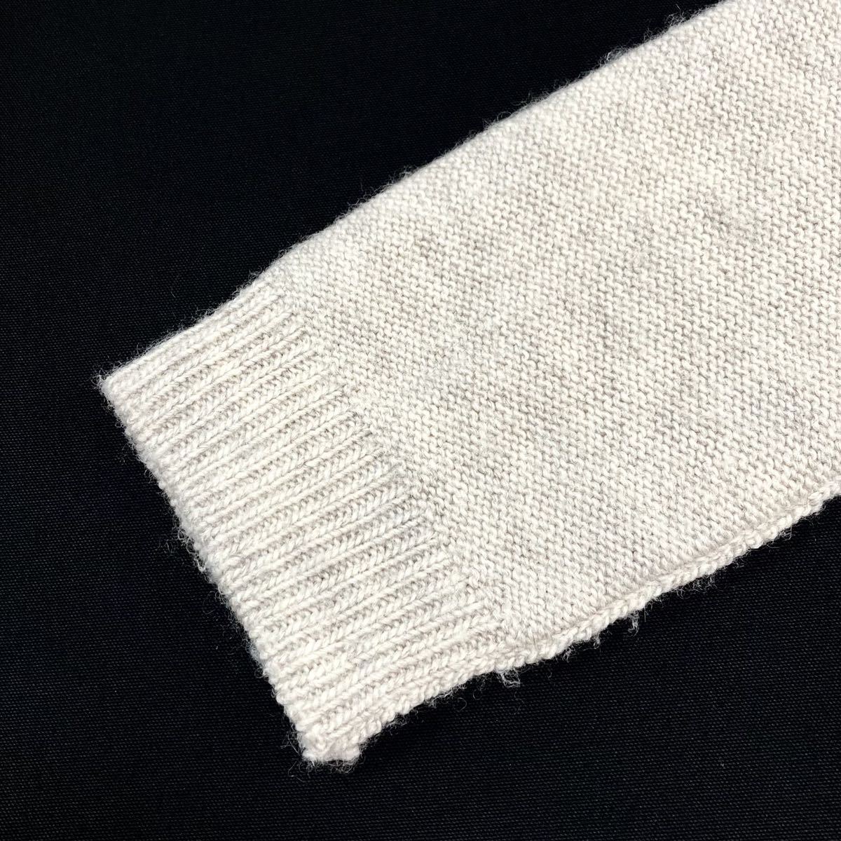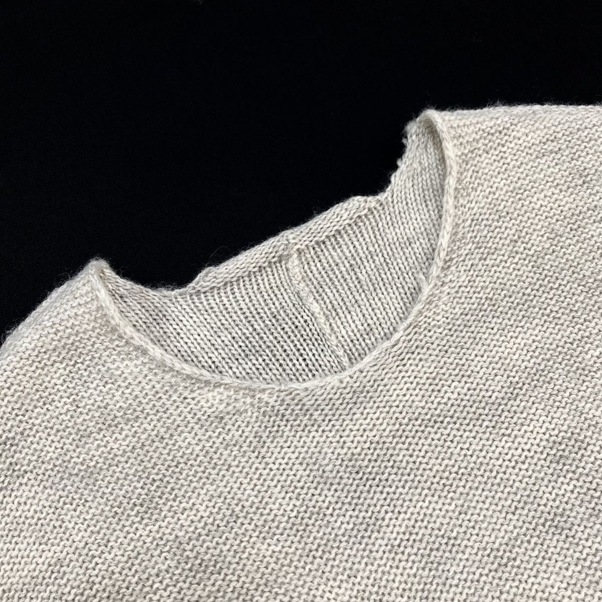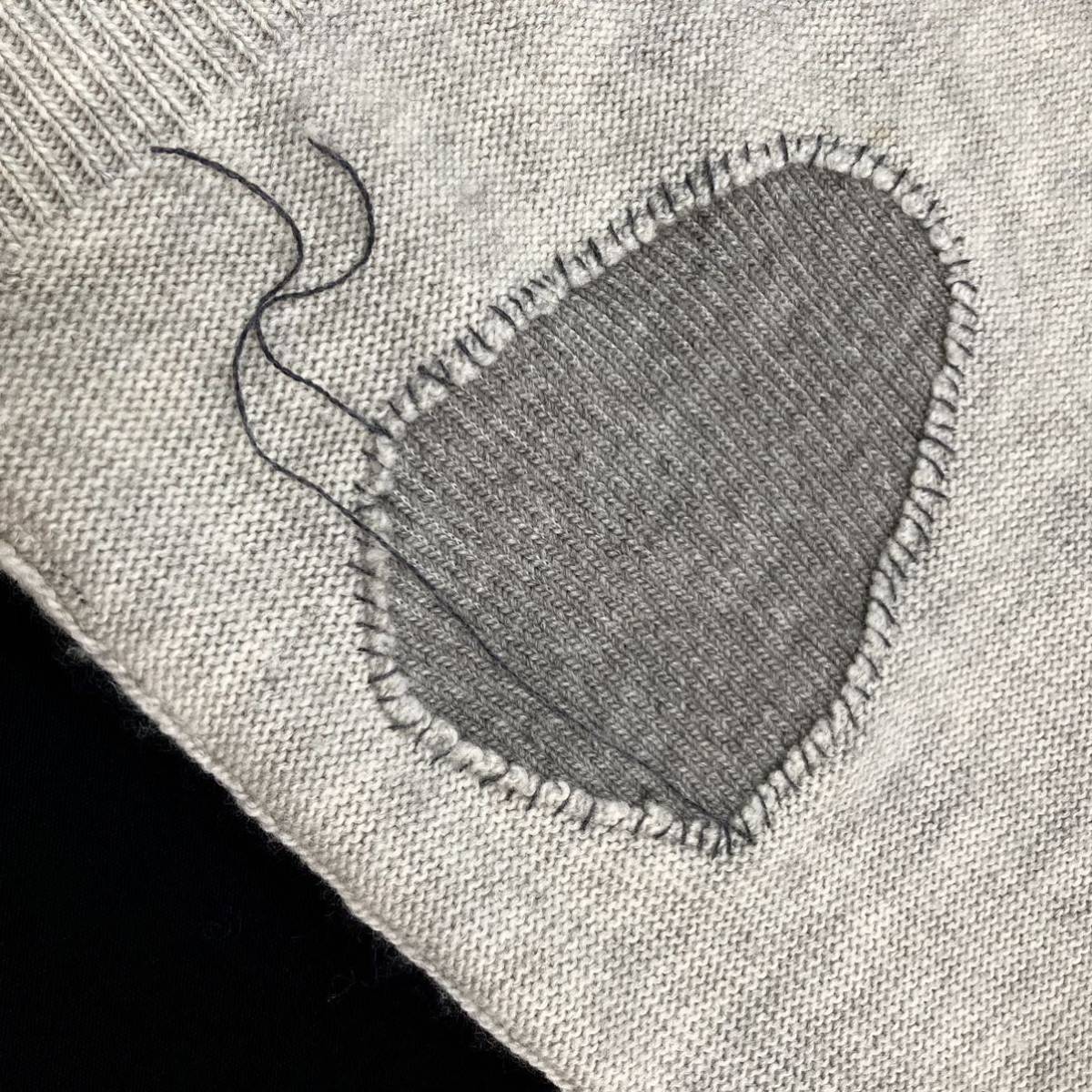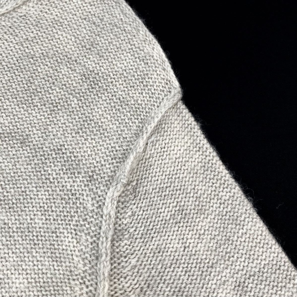 成型編みした身頃にハサミで大胆に穴を開け、裏から別布をあてがいひと針ひと針ハンドステッチでざっくりとかがった味のあるプルオーバーニット。穴部分の別布と温かみのあるハンドステッチが美しく融合したニットは、裁ち切りの襟元がワイズらしいラフな印象で1枚でも様になるアイテムです。