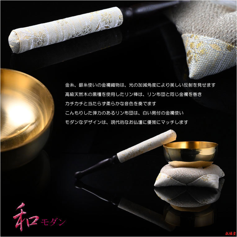 コンパクトな浅広リンに金襴織りのリン布団、黒檀リン棒付きセットに