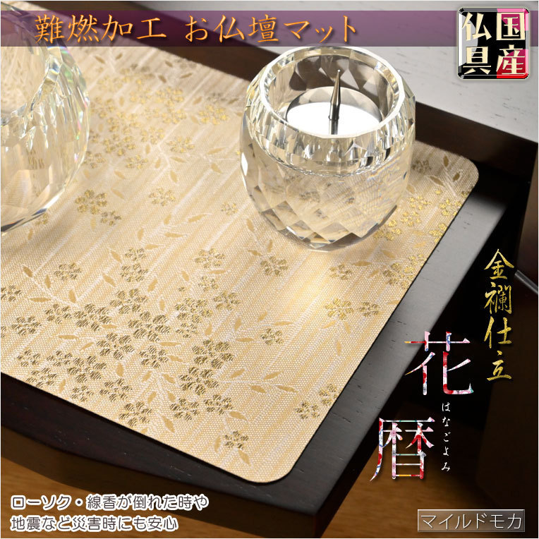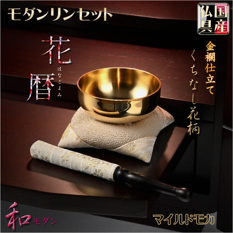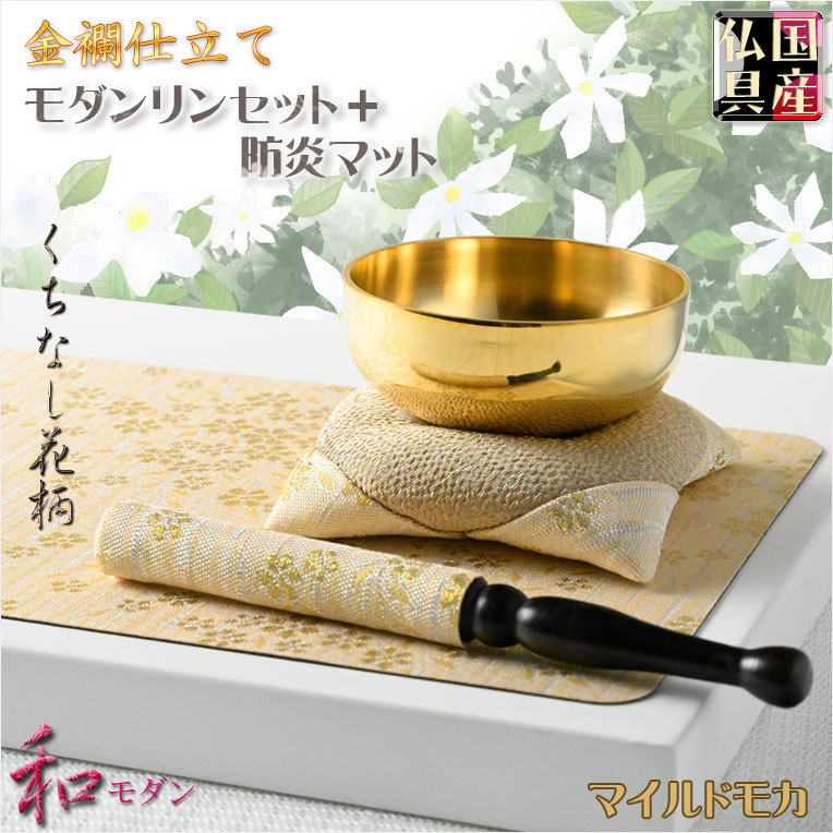 国産仏具【金襴仕立・モダンリンセット+防炎マット:花暦(はなごよみ)くちなし柄・マイルドモカ】仏壇用仏具 おりん 送料無料