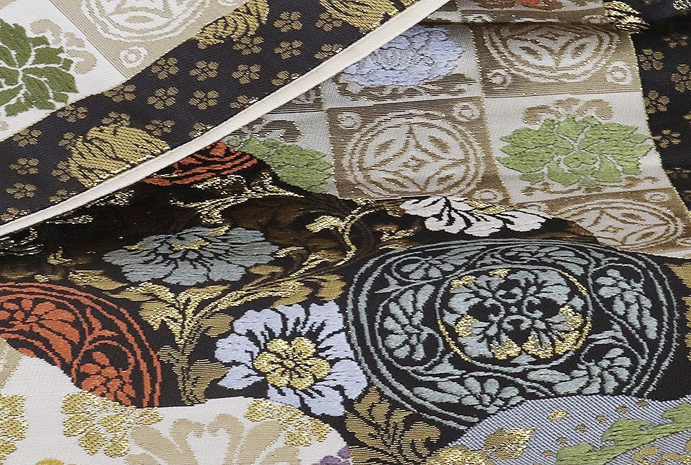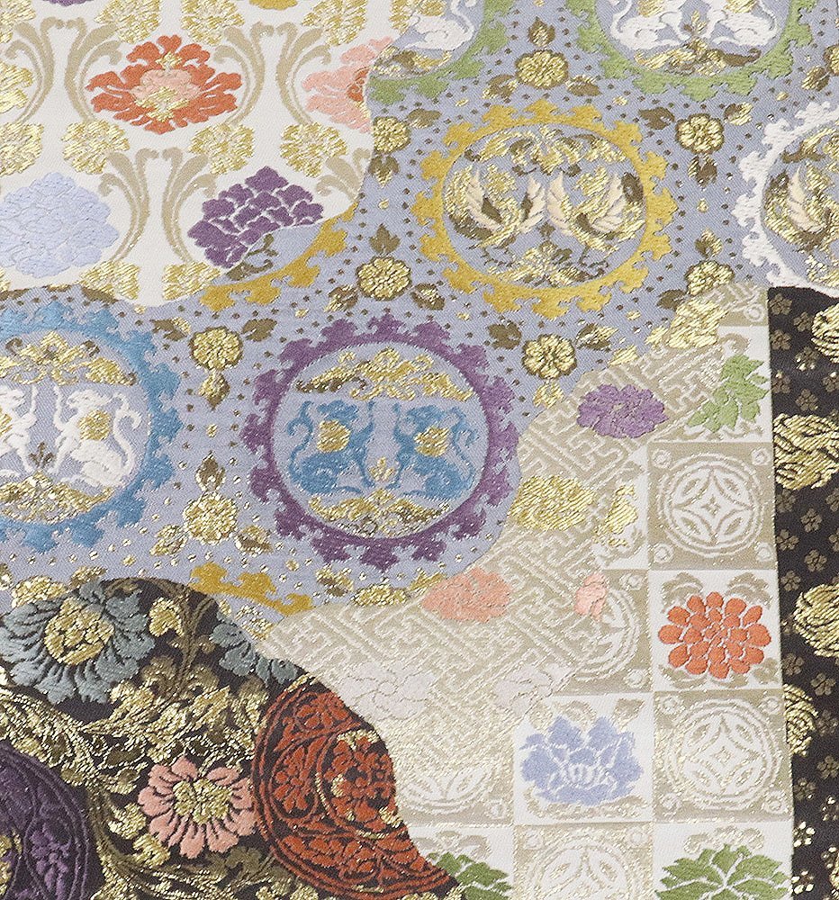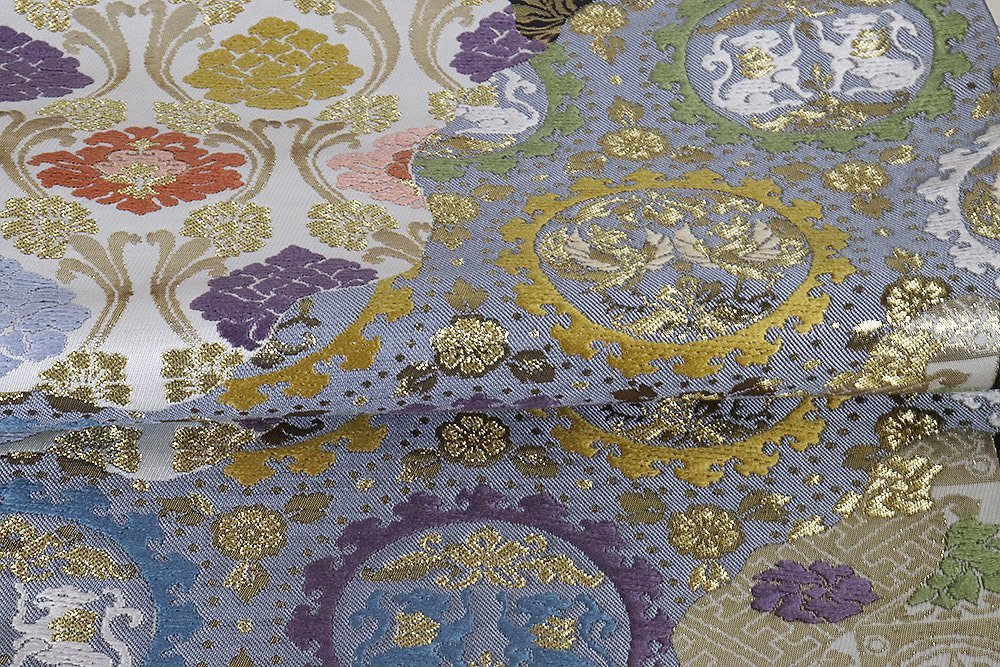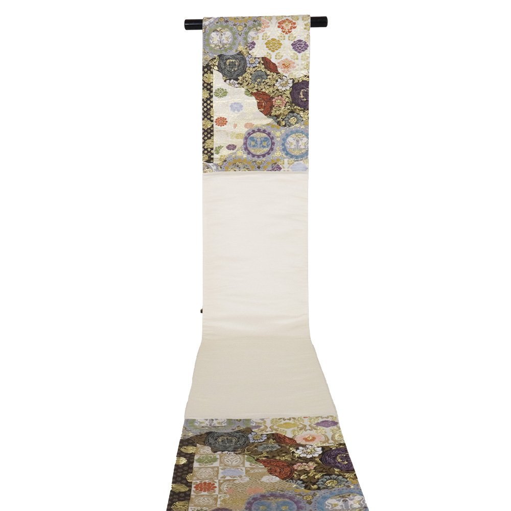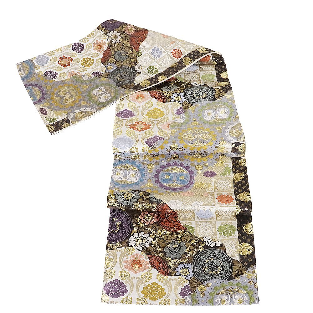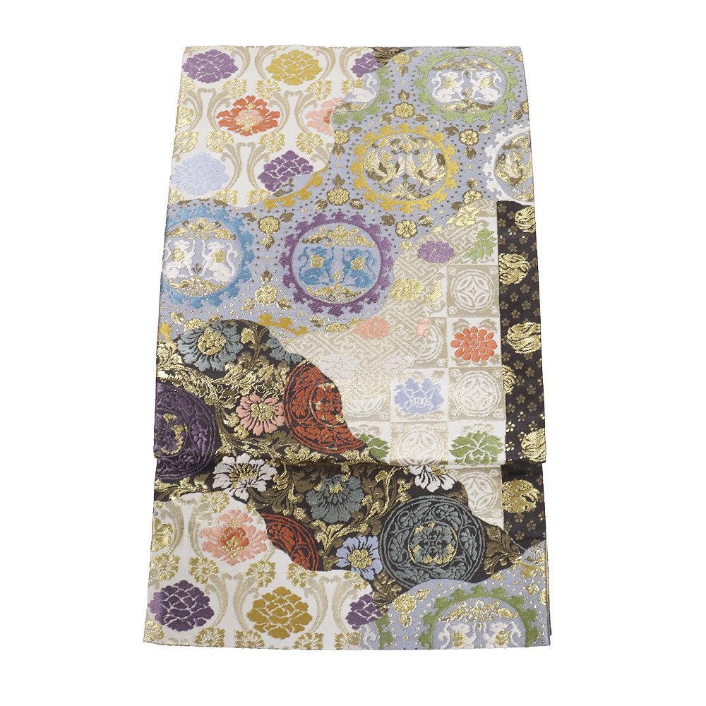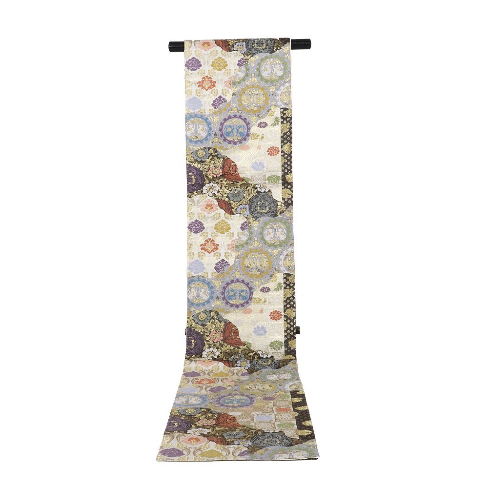 | 西陣織袋帯 金箔・白・グリーン・紫・赤・オレンジ・黒地 正倉院文様 向い鳳凰・獅子・唐花・華文 未使用品 仕立て上がり | |