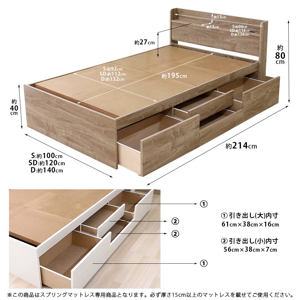 セミダブル:120×214×80cm(床板面高40cm・マット面高56cm)