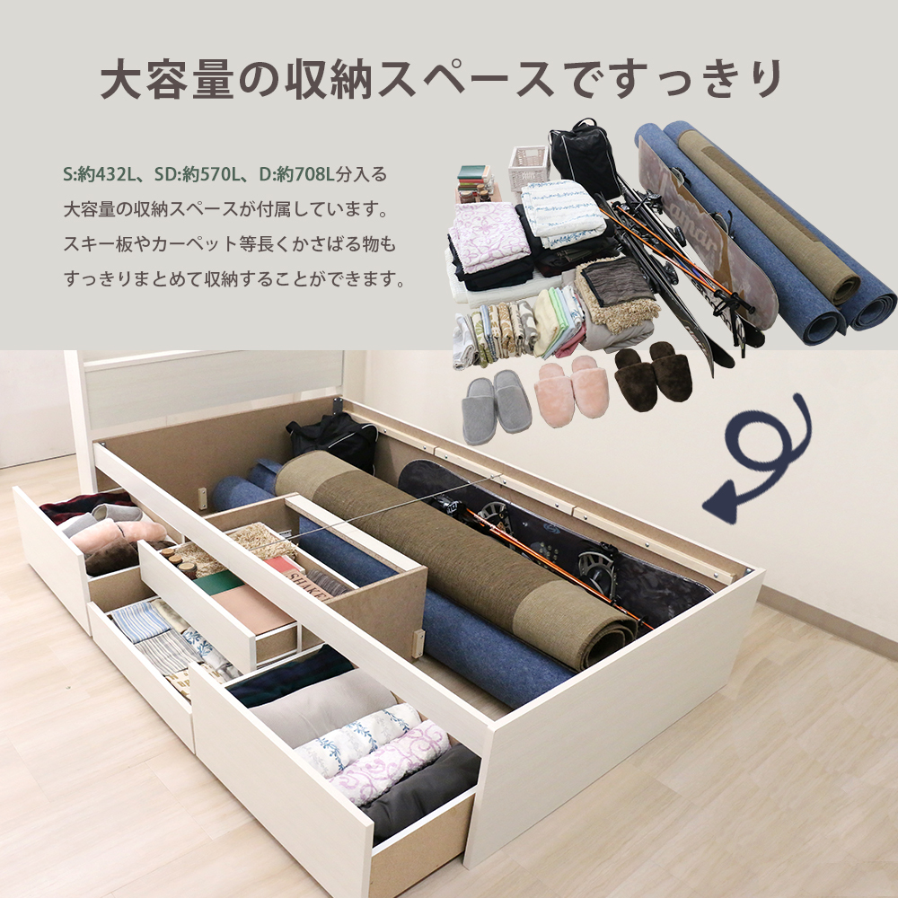床板の下(ベッド内部)は長尺収納にも対応しております。