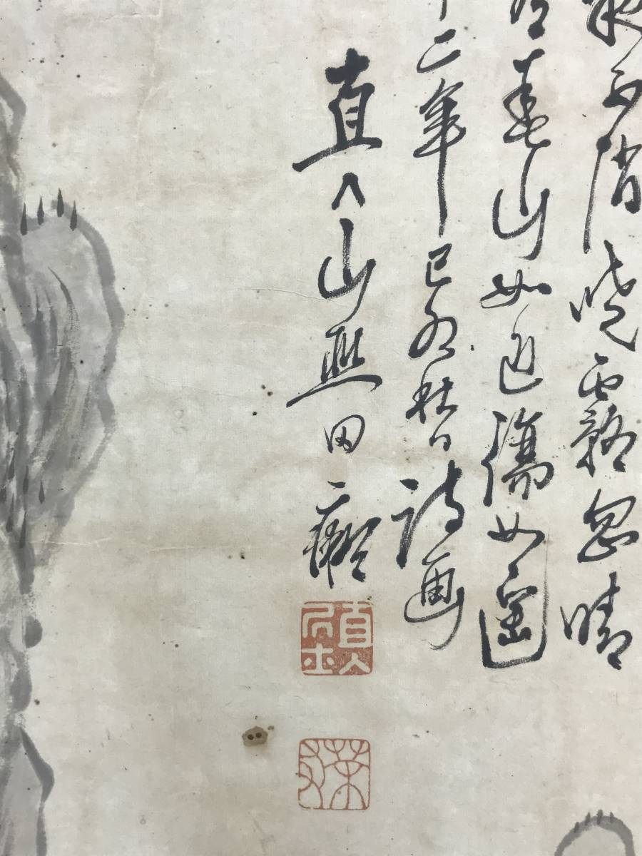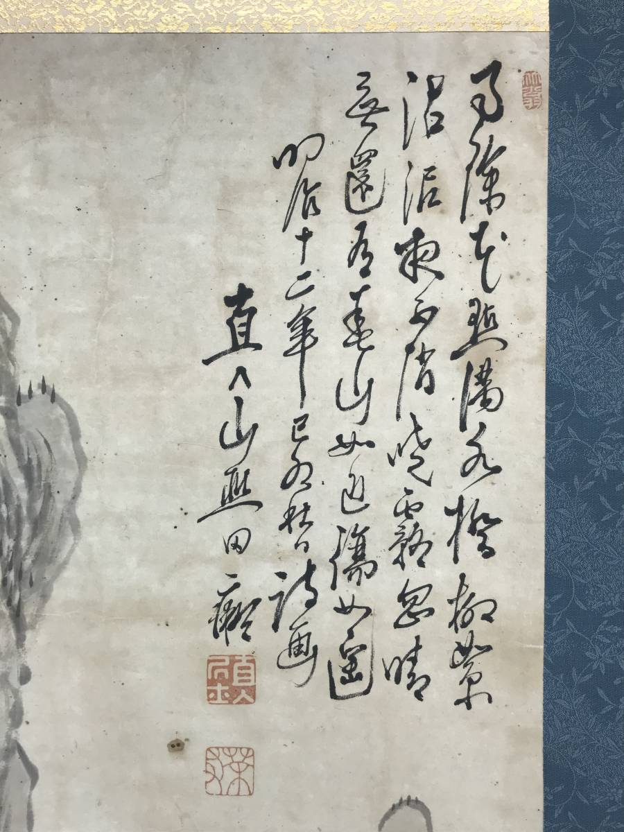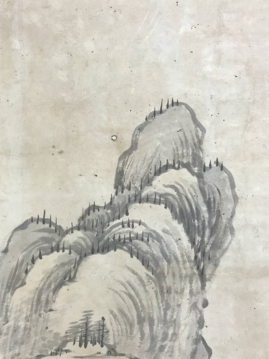 【作品状態】 本紙は紙本肉筆です。  本紙は薄汚れ、全体に多数の汚れシミあります。表装は概ね良好です。