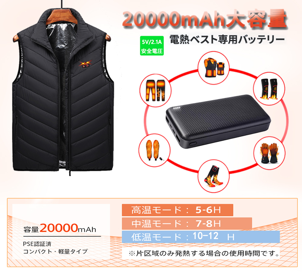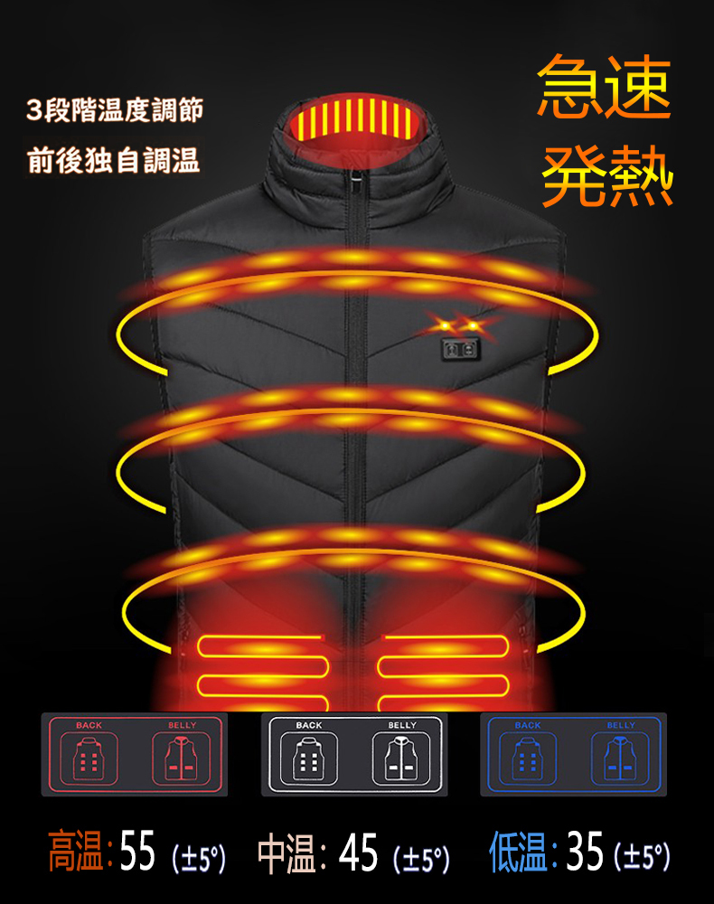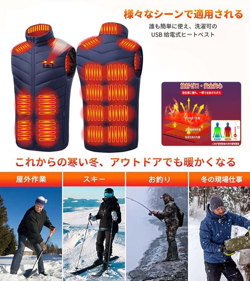 【素材構成】: 表・裏地:ポリエステル100%, ヒーター:グラフェン繊維ヒーター, 中綿:中わた 【カラー】:ブラック,ネイビー 【付属】:20000mAhバッテリー バッテリー接続用USBケーブルが付属しています。5V/2AのUSB出力充電式モバイルバッテリーをオススメします。 ※サイズとカラー選択可能です、落札後、ご要望のサイズとカラーを提示くださいませ。 ※素人採寸の為、誤差が生じる場合がございます。ご了承下さいお願いします。 ※撮影時の照明やPC設定・環境により、色具合に差異がある場合がございます。 ※ 連続使用時間は目安です。外気温など使用状況により異なります。 三階段温度調節: ワンボタンで温度三段階までコントロールができますのでとても簡単便利です。 指示ライトボタンを押せば 強 中 弱の3段温度が設定できます。 ○生産により一部の製品のUSBケーブルは外部ポケットにあります。商品はランダムに発送されます。 洗濯ヒント: 1.モバイルバッテリーを取り出し、適度な洗剤を加えて洗ってください。 2.高温の水は使わないでください。 3.力強く揉んでないください。 4.洗濯した衣服は脱水、手で絞らないでください。換気の良い場所に置いてください。 最大洗濯水30°で手洗い限定(ねじれ/洗濯機/アイロン仕上げ/漂白剤など禁止です/洗濯する前に必ずバッテリーを取り外してください) 健康効果: 防寒&上下の伸縮性に優れたストレッチ素材で、動きやすく窮屈な締め付けがありません。汗や水分を素早く吸収・乾燥させて常に快適な状態を保ちます。超厚手生地でありながら、裏起毛で、もこもこした肌触りが気持ちよく、着た瞬間から暖かさを感じることができます。 寒い冬には一点を持ちますと冬将軍に怖くありません。血行を促進して湿気を追い出します。 赤外線発熱します。性能は安定であり、感電危険性ゼロ、放射問題なし、安心的にご利用ください。 | |||