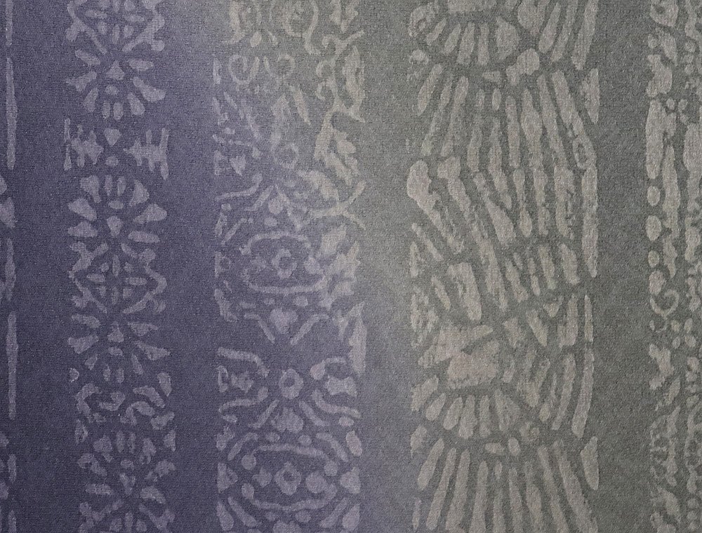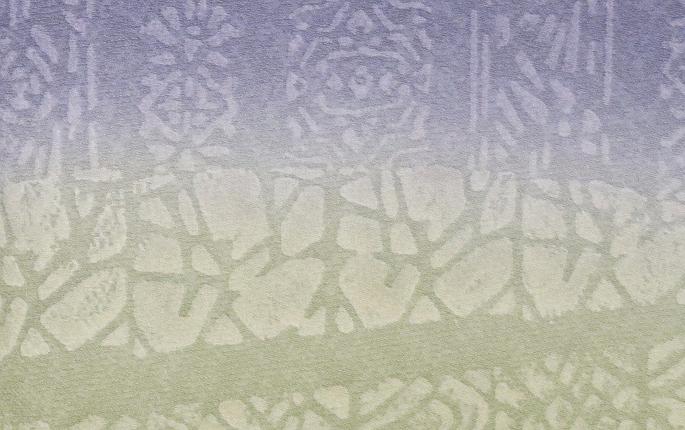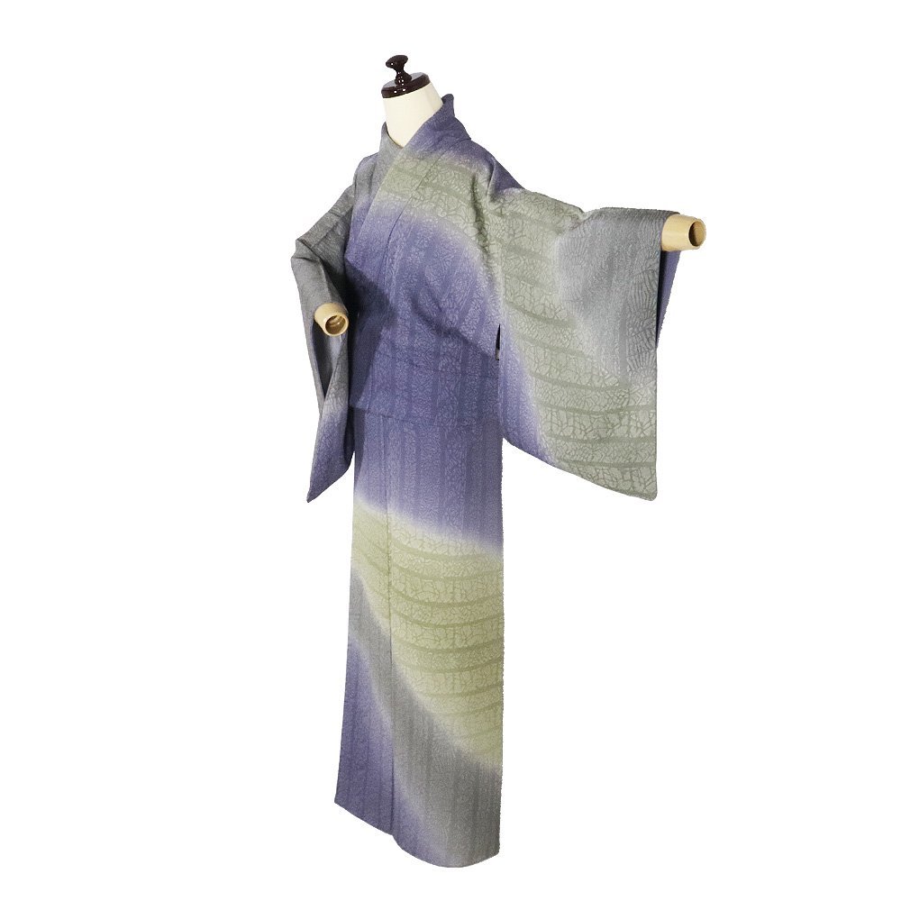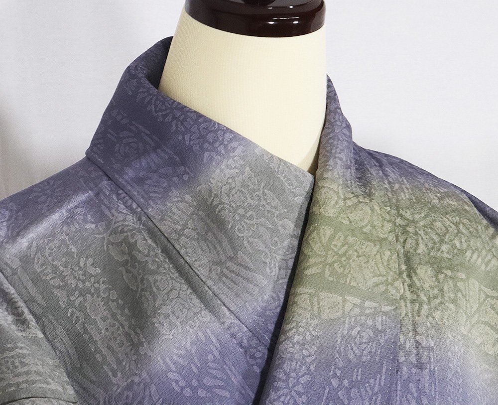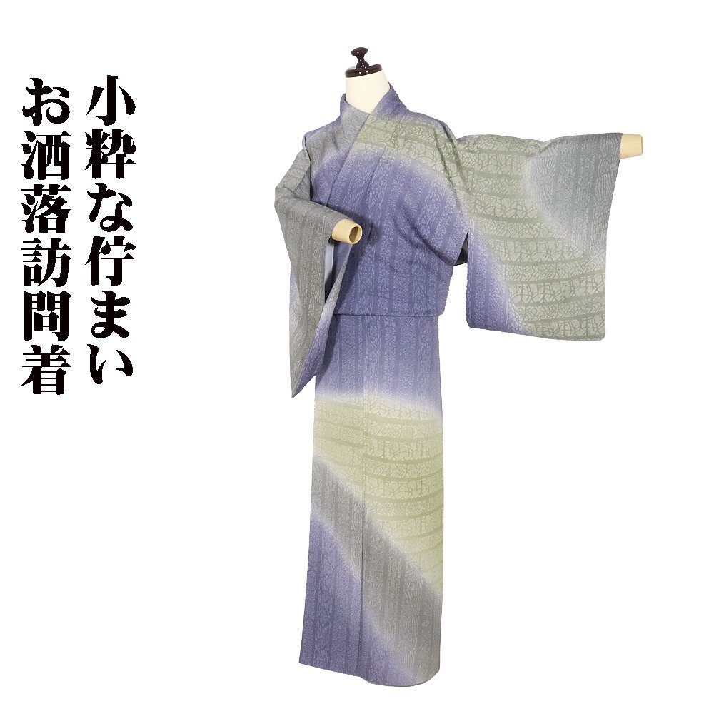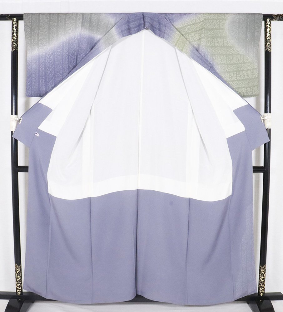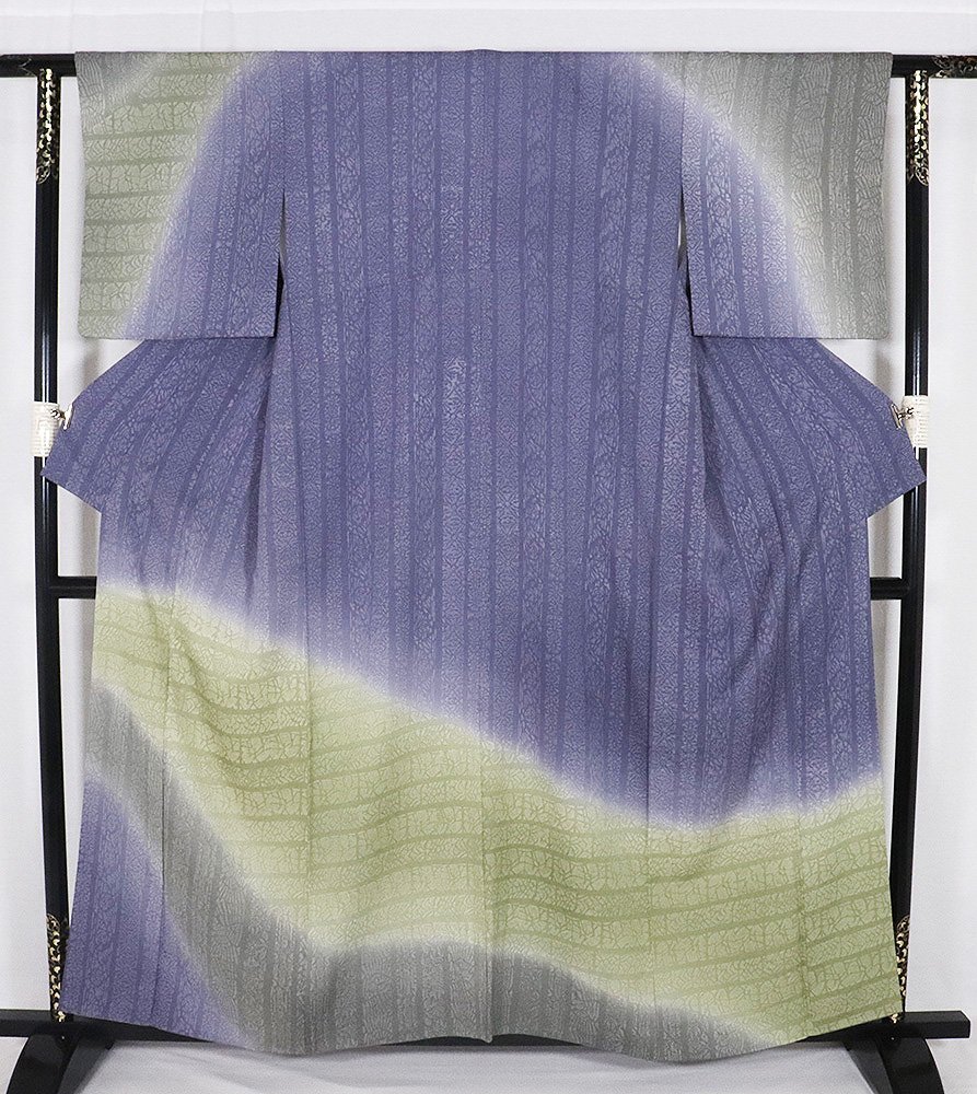 | 友禅訪問着 袷 丹後縮緬地 紫・薄緑・緑・友禅暈し地 古代花・縦縞 石垣模様・横縞 165 広襟 15号 | |