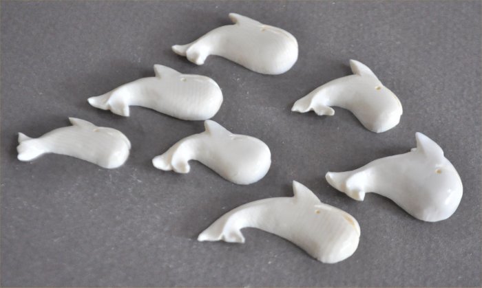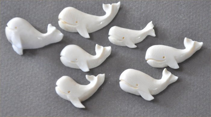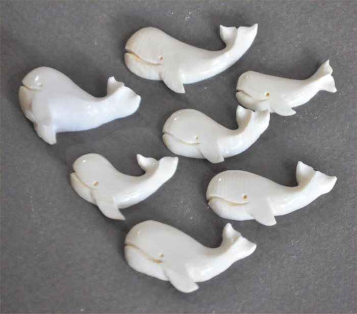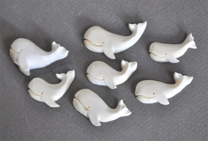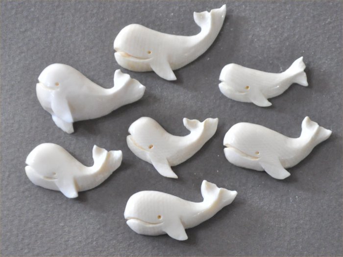 ナンタケットバスケット用のマンモス牙のミニクジラ達7頭のオーナメントサイズは36mm×19mm×5mm 32mm×19mm×6mm 32mm×17mm×5mm 32mm×19mm×9mm 28mm×16mm×5mm 27mm×19mm×5mm 26mm×14mm×4mm磨き仕上げ7頭のミニクジラで自分独自のいろいろな飾り方出来るオーナメントです。