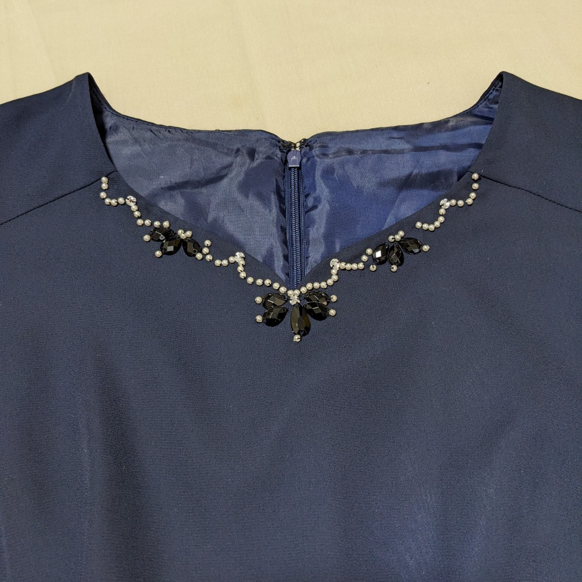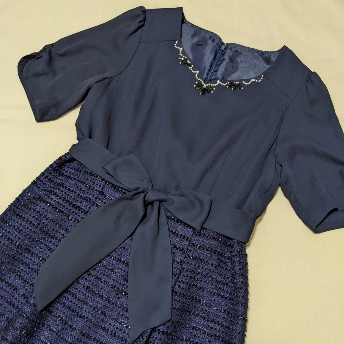 胸元のビジューがポイントのワンピースです。