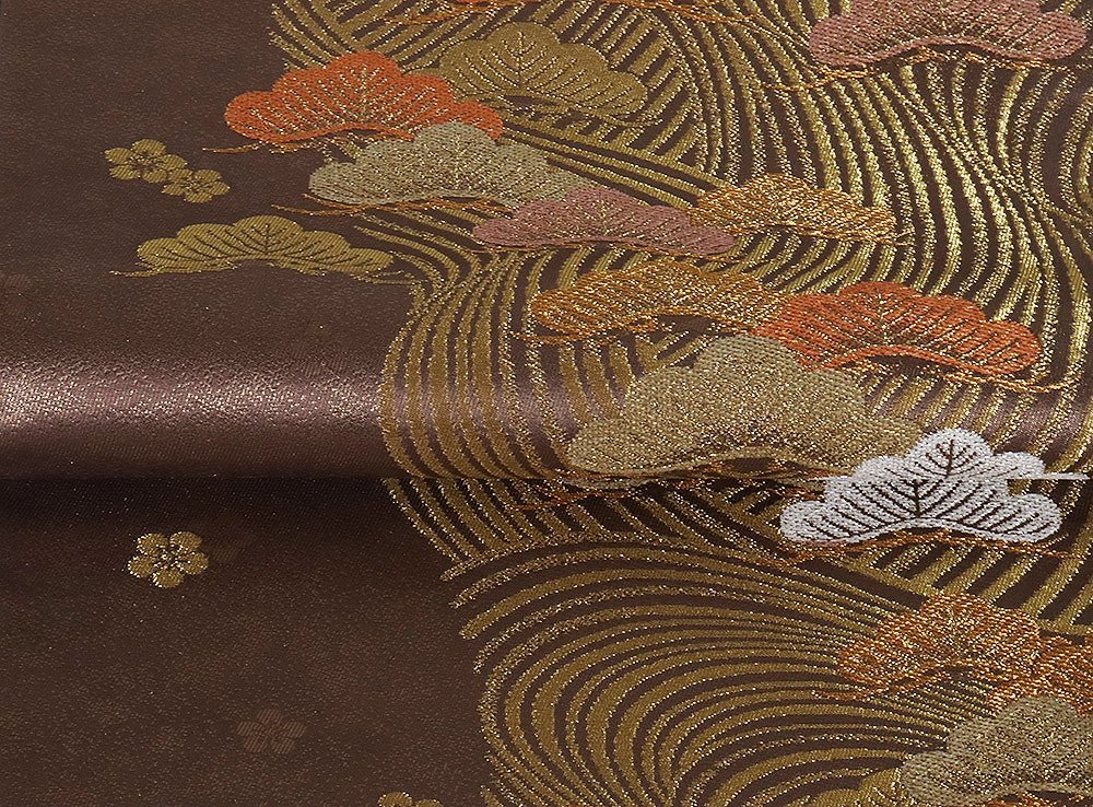 | 西陣織袋帯 小豆色・金箔地 松・梅・波 未使用品 仕立て上がり |