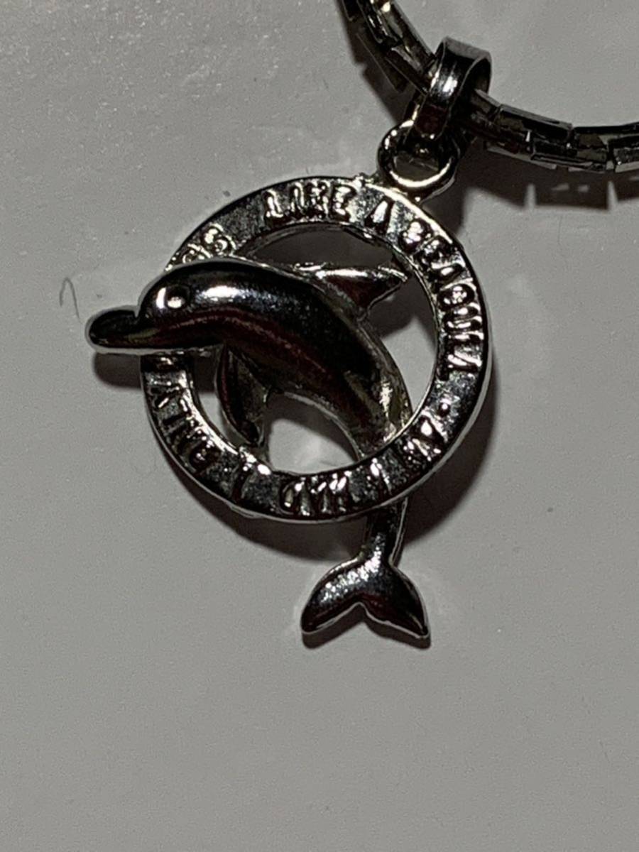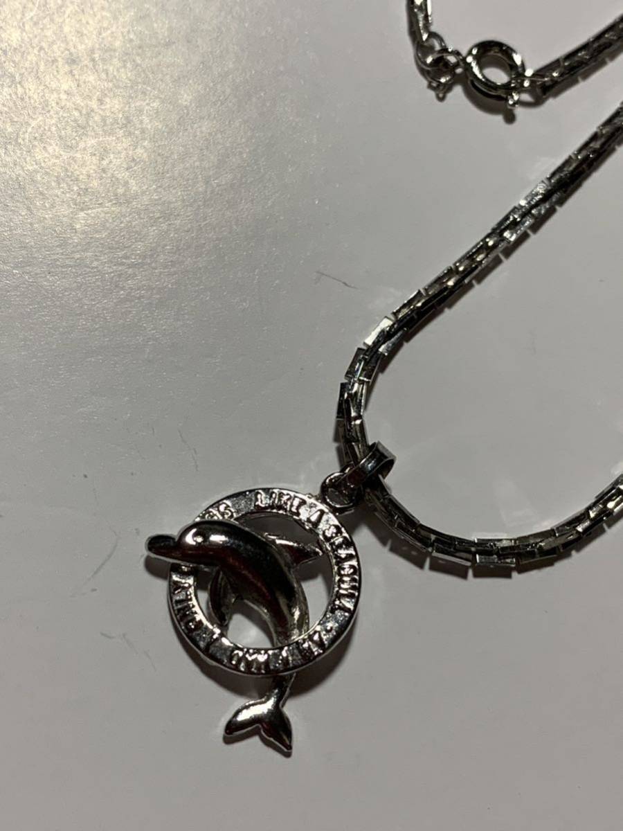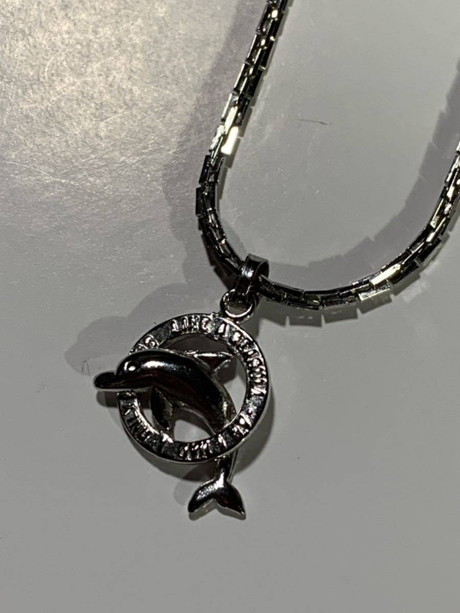 シルバーカラー、イルカのペンダントネックレスです、トップのサイズは17×17ミリ、チェーンはスネークチェーンを使っており、長さは48センチです