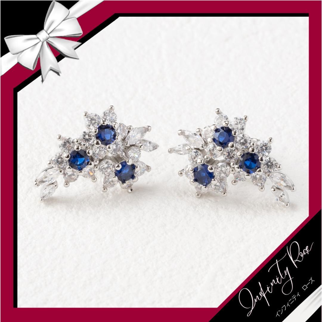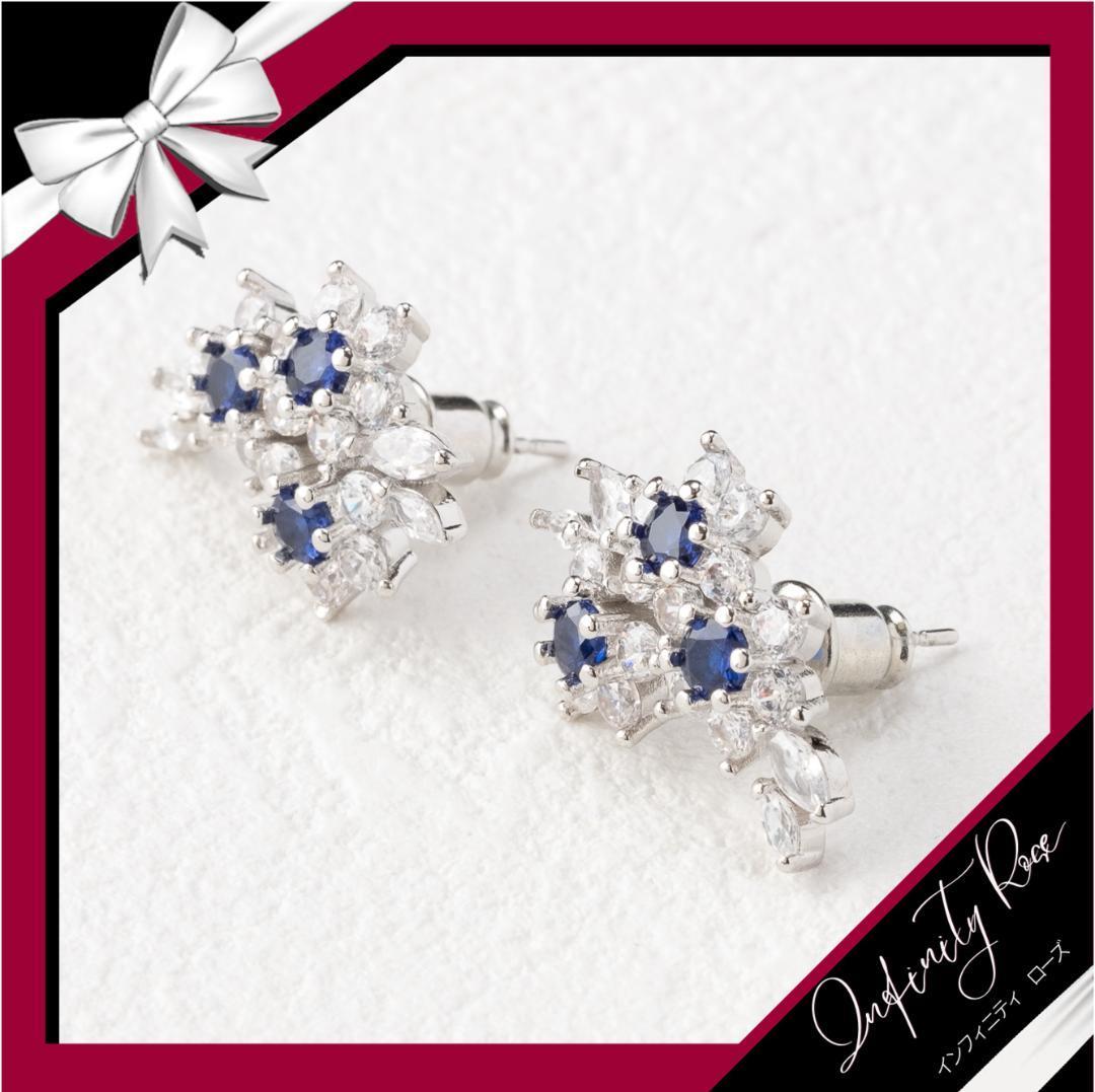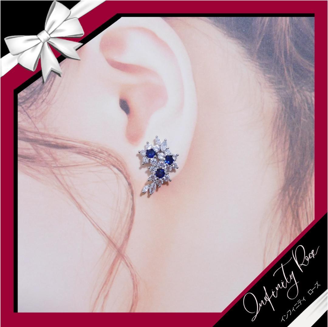 (5032)ダークブルークリスタルピアス 3つの可憐なお花 高価爪留め仕様 スワロフスキー製クリスタル使用