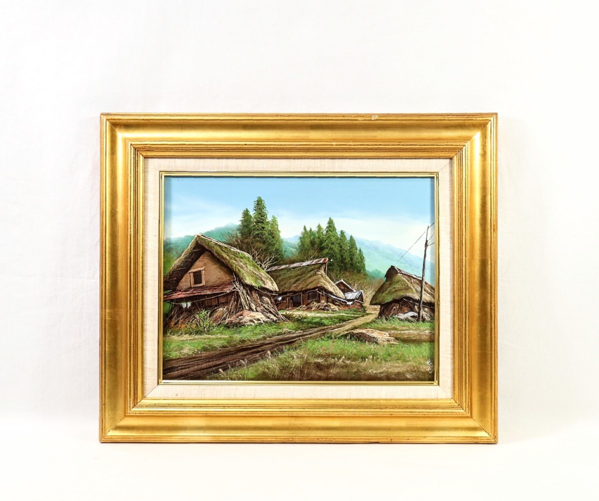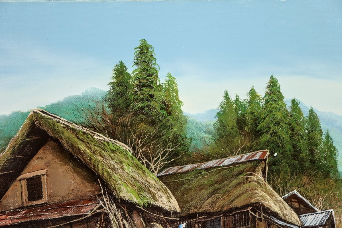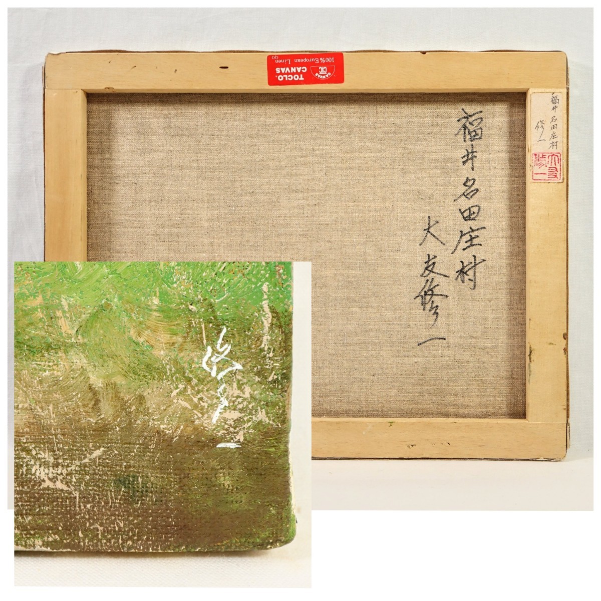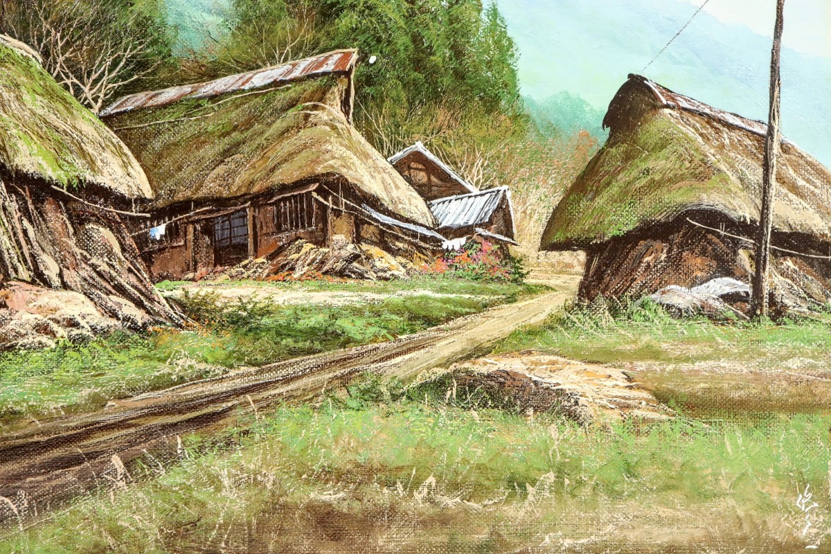 真作 大友修一 油彩「福井名田庄村」画 F6 福島県出身 新世紀会員 能坂太郎に師事 小径沿いの茅葺き屋根の古民家集落を細密描写で描く 8305