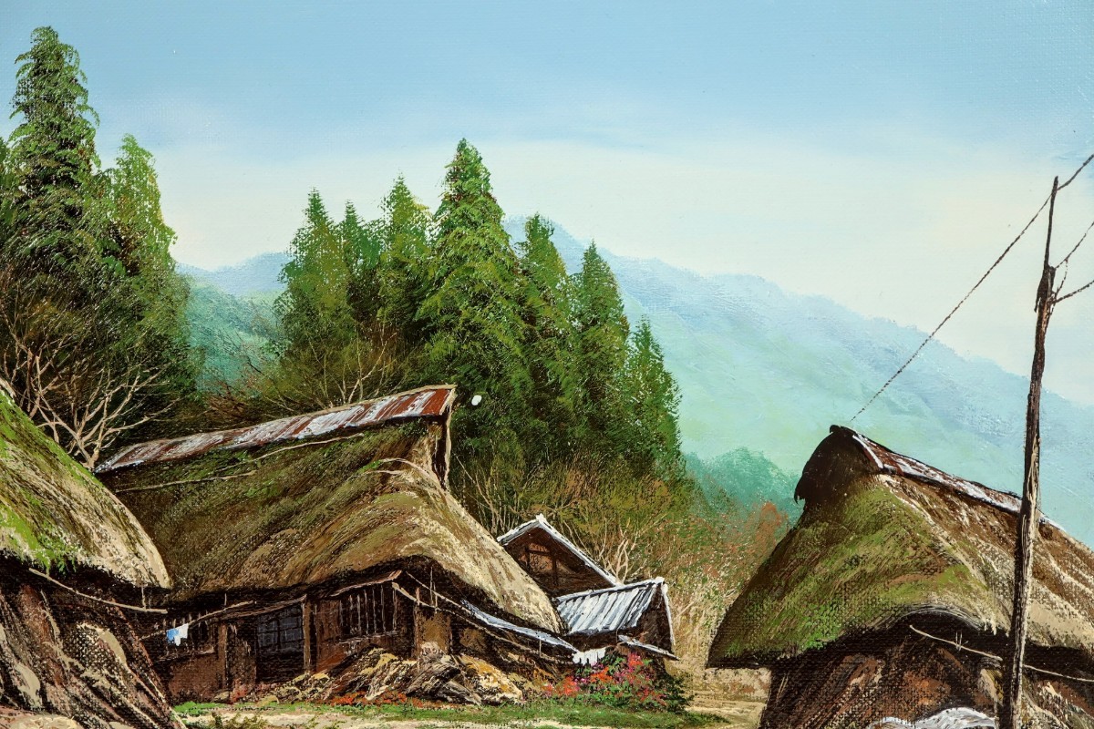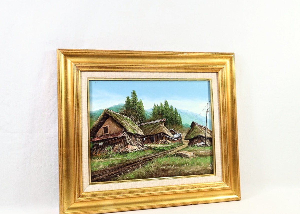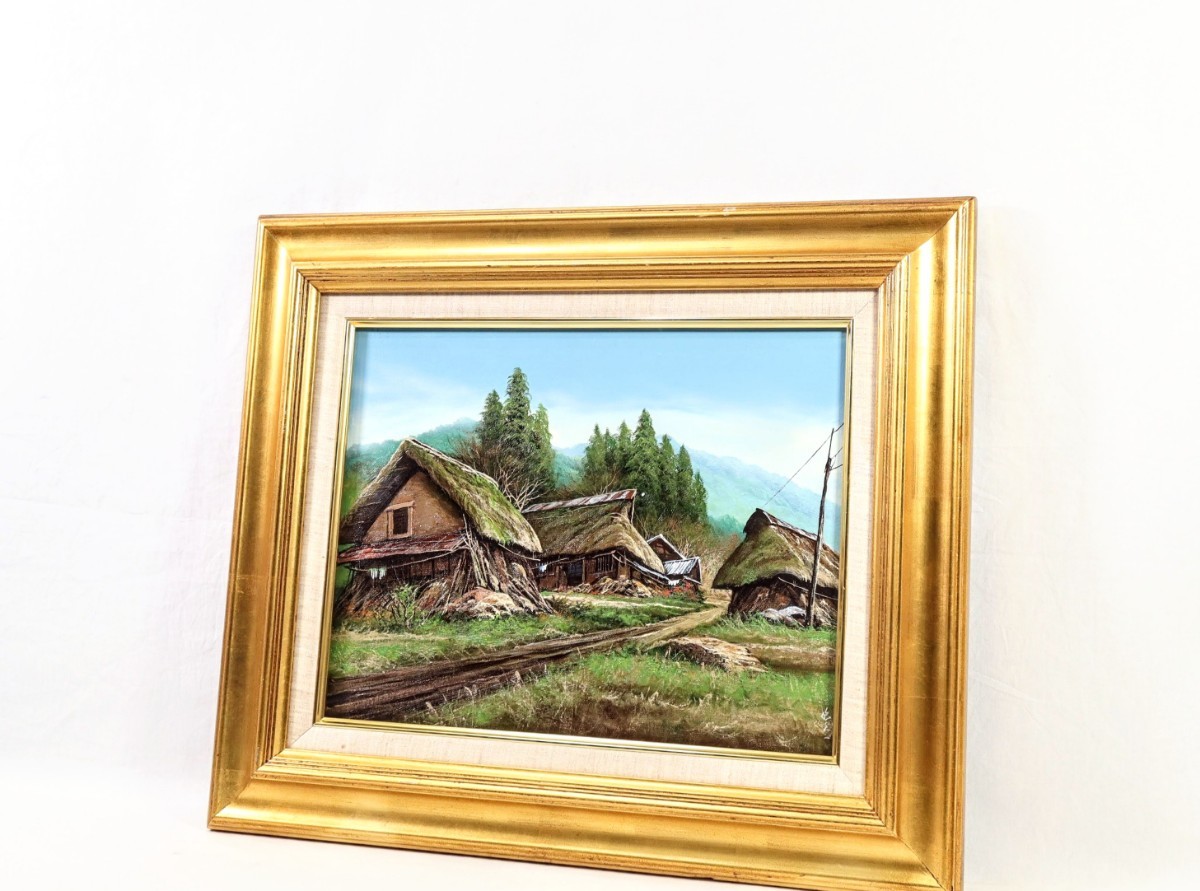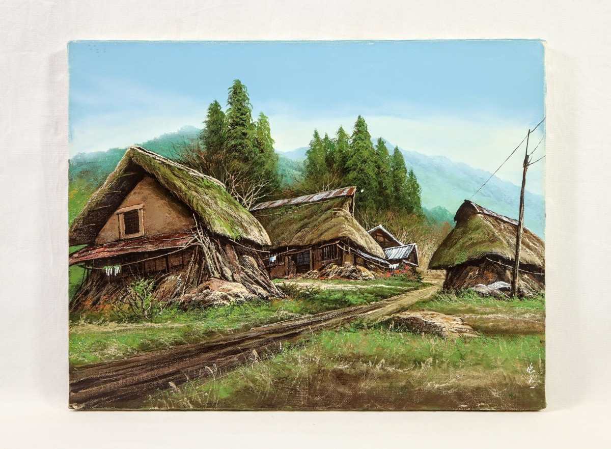 真作 大友修一 油彩「福井名田庄村」画 F6 福島県出身 新世紀会員 能坂太郎に師事 小径沿いの茅葺き屋根の古民家集落を細密描写で描く 8305