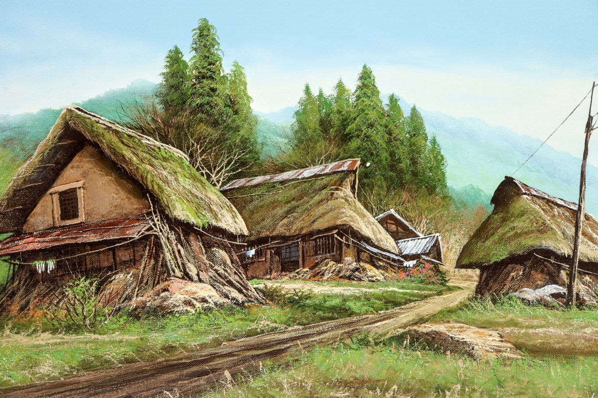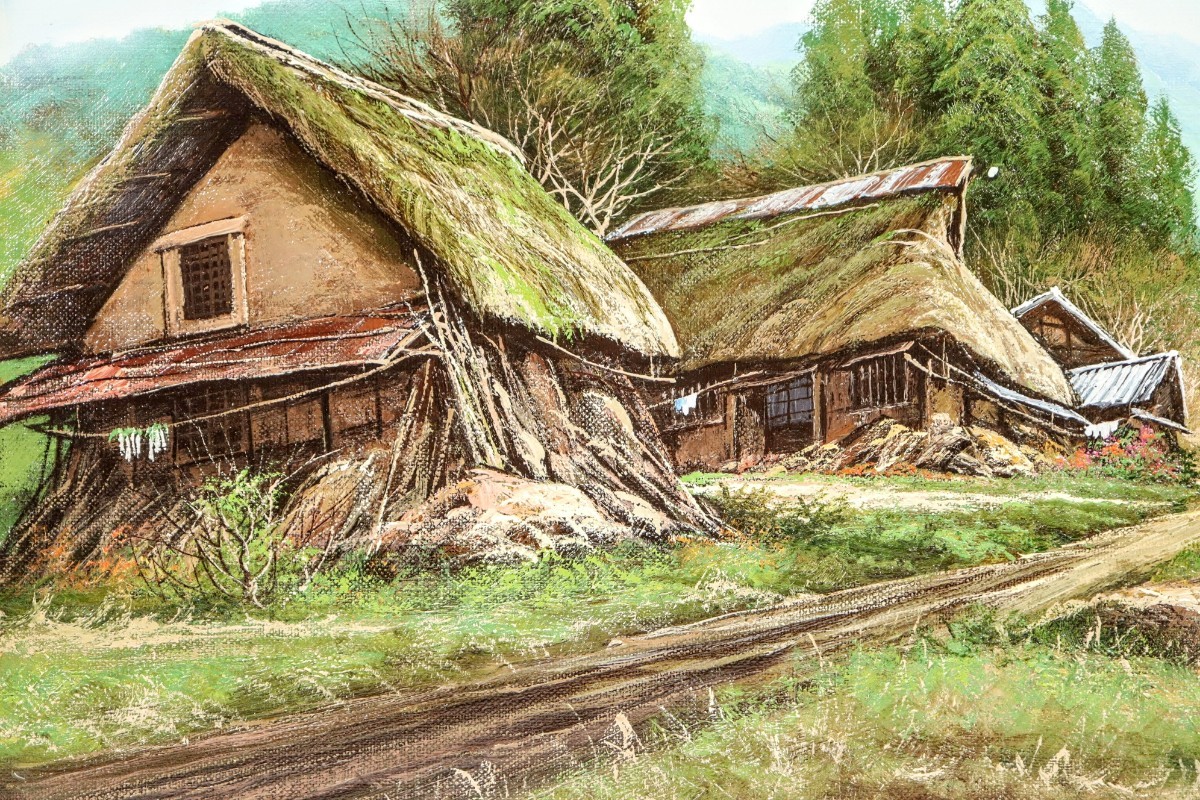 道端の雑草や茅葺き屋根の苔など精密描写、丁寧に描きこんだ