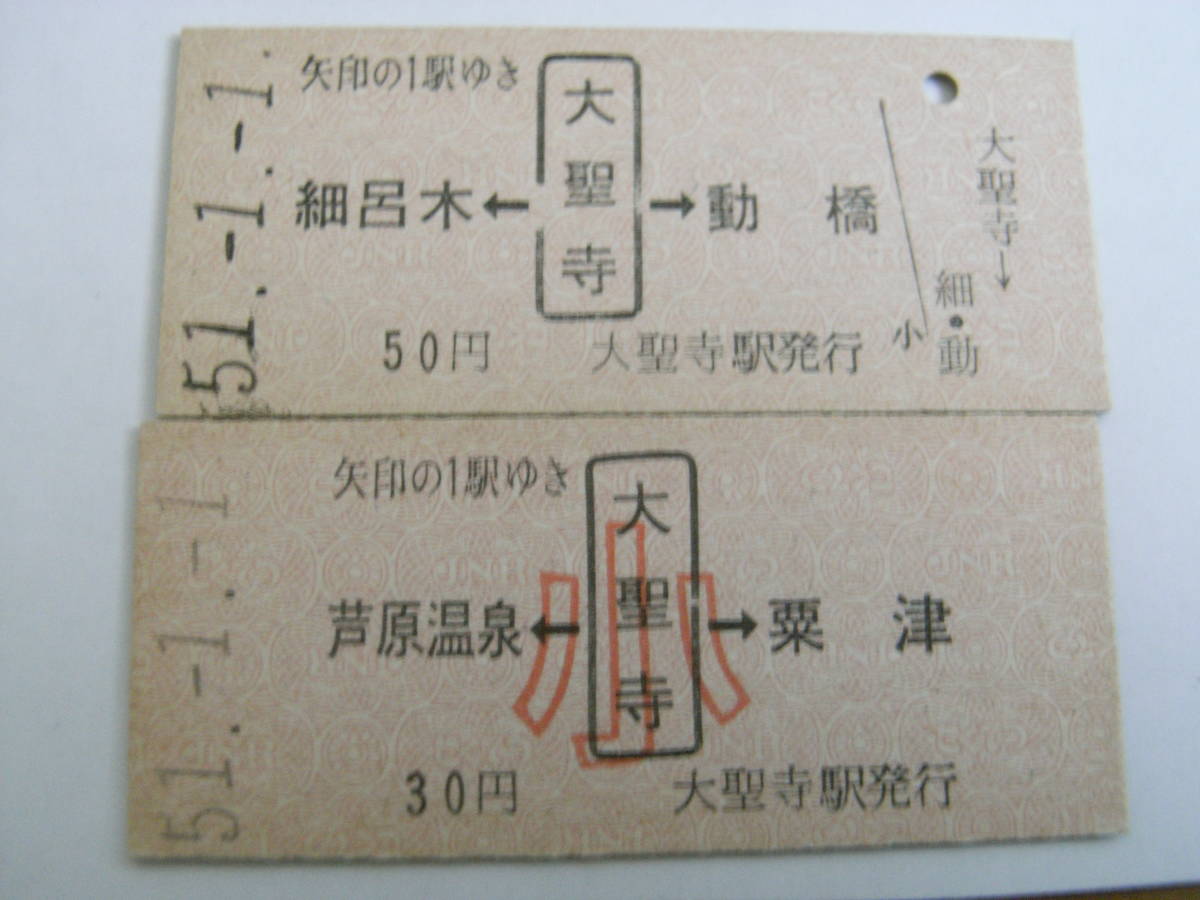 2枚/北陸本線 芦原温泉←大聖寺→粟津 昭和51年1月1日 大聖寺駅発行 大・小 計2枚