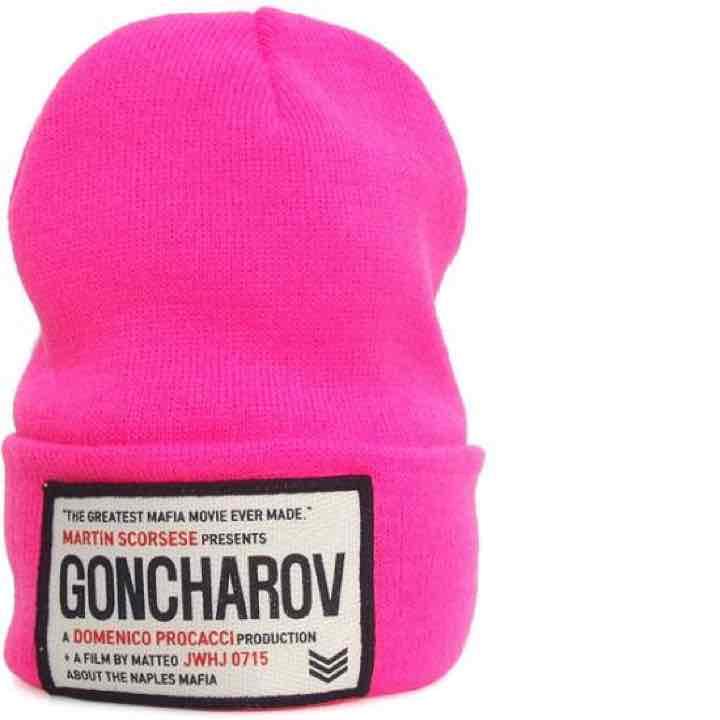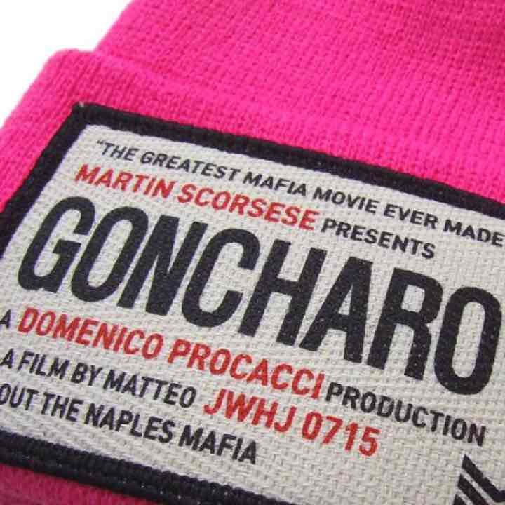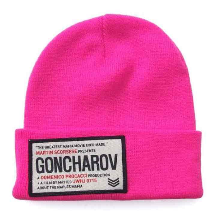 フロントにインパクトのあるネームタグの付いたニットキャップ。