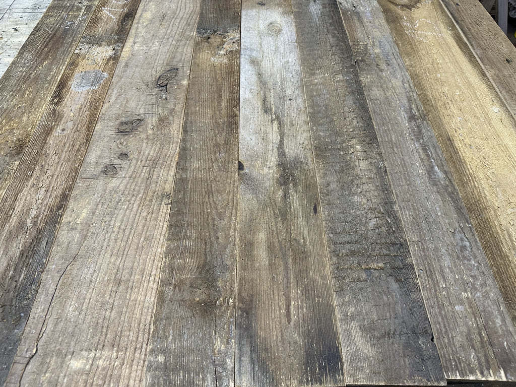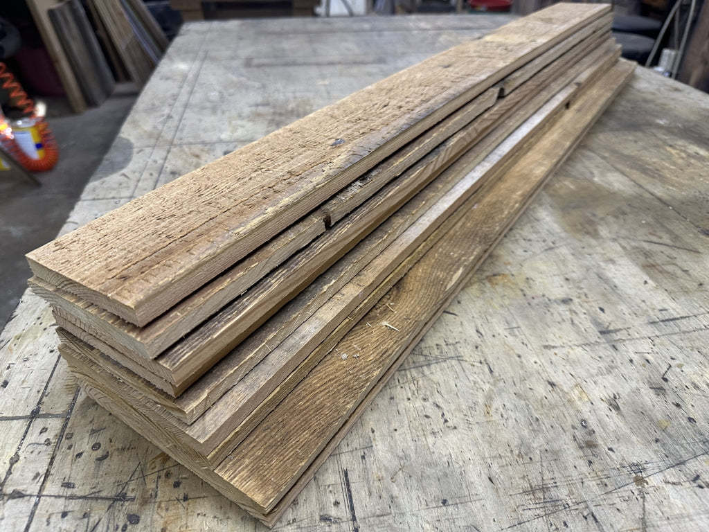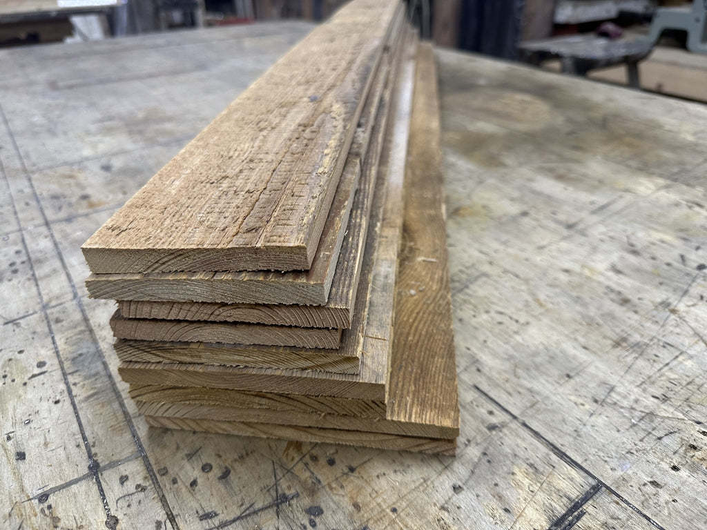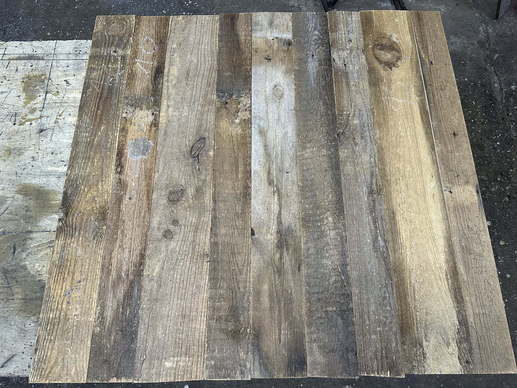 | 1枚のサイズ(古材や加工品の為、若干のばらつきはございます) | 1束で1m2分となります。 厚み:7-12mm 幅:90-140mm 長さ:1000mm |