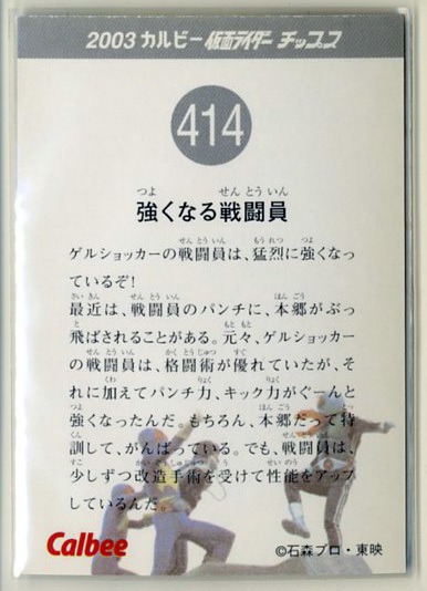 | ◆防水対策 厚紙補強 カルビー 仮面ライダーチップスカード(2003 復刻版) 414番 強くなる戦闘員 トレカ 即決 | |