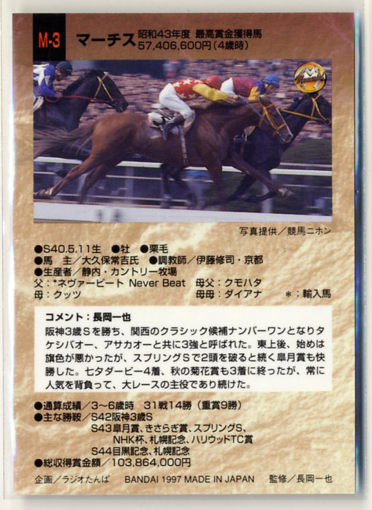 | ★マーチス M3 メモリアルカード バンダイ サラブレッドカード 97年上半期版 保田隆芳 皐月賞馬 写真 画像 競馬カード 即決 | |
