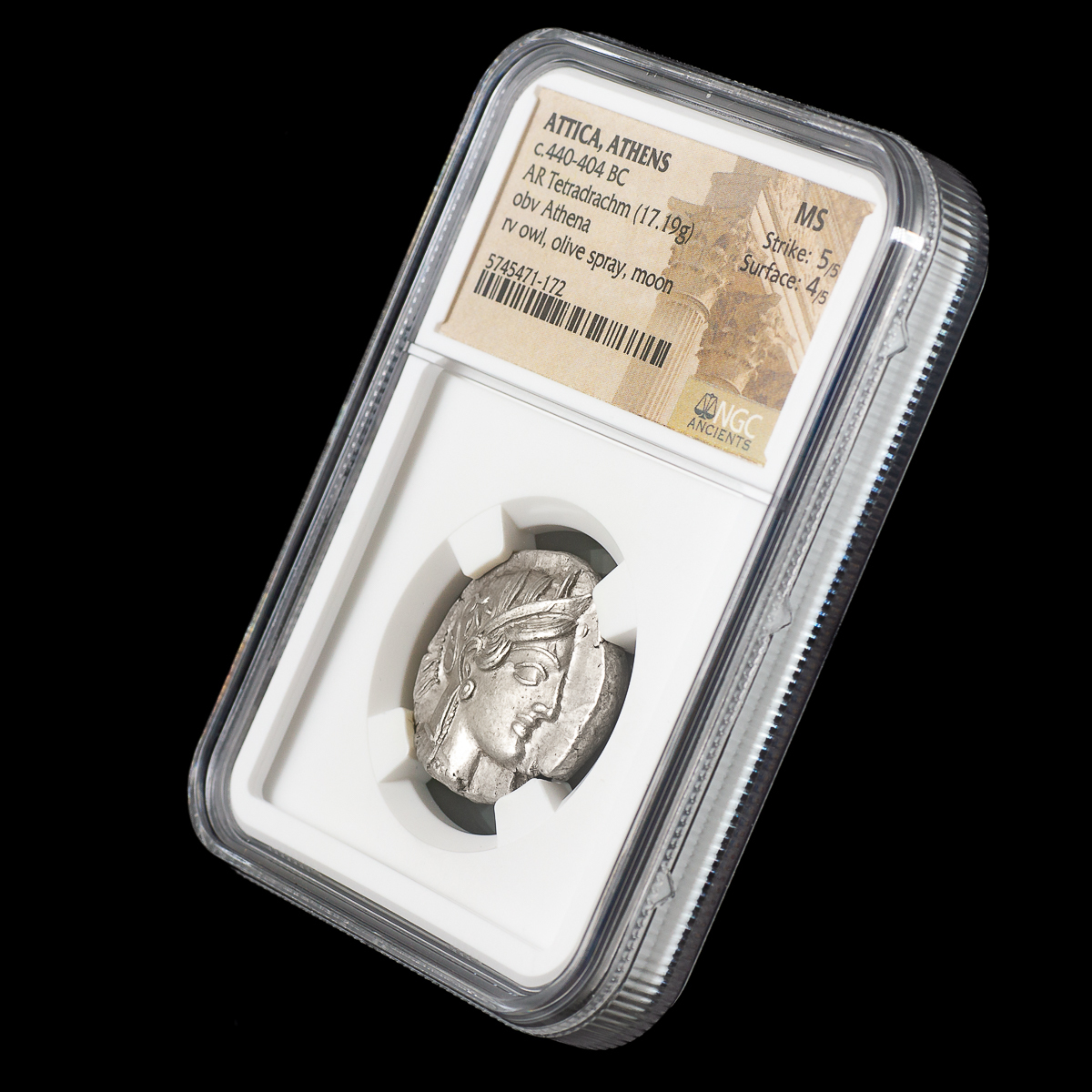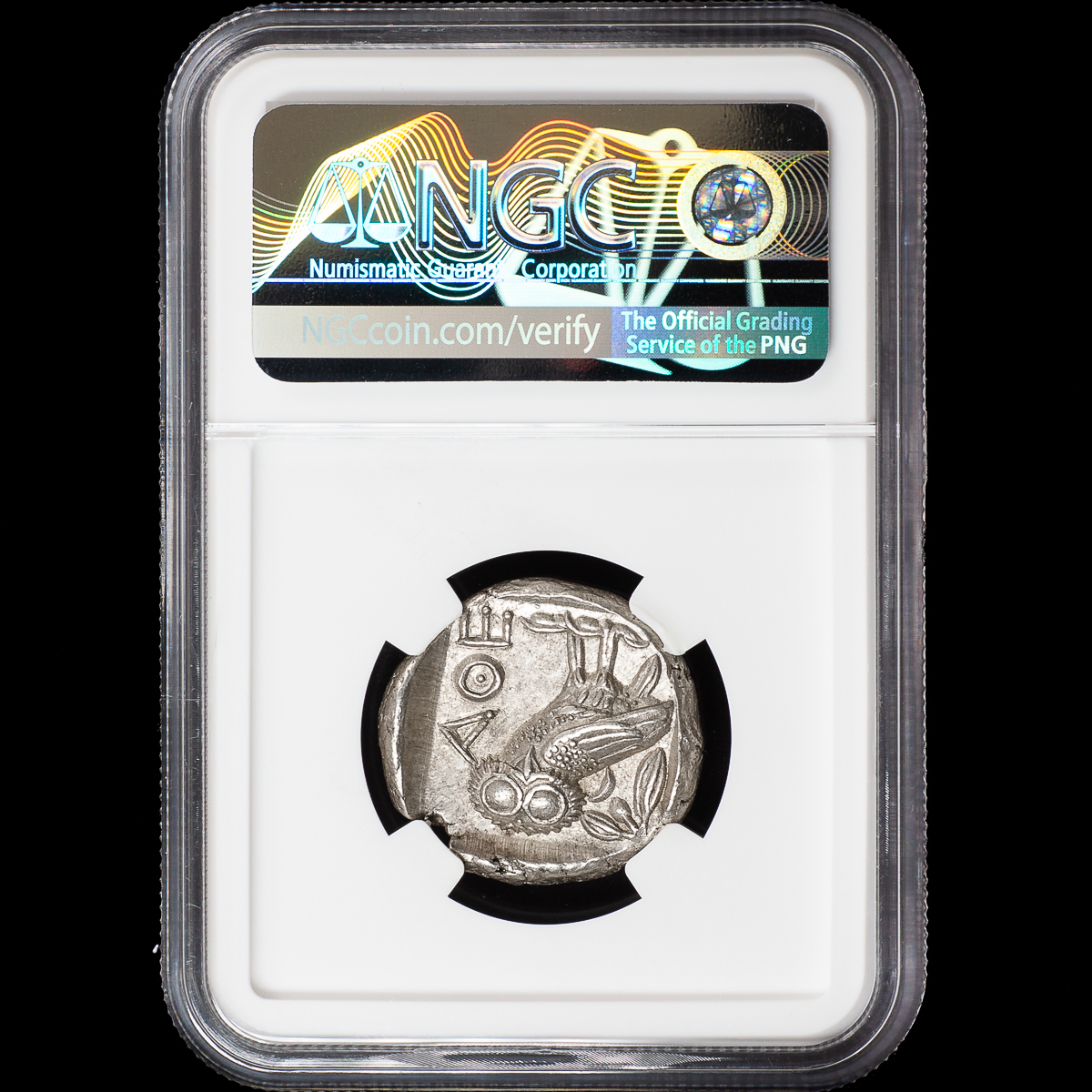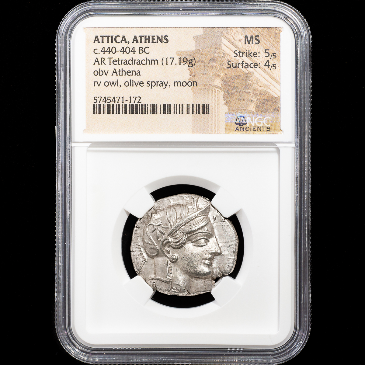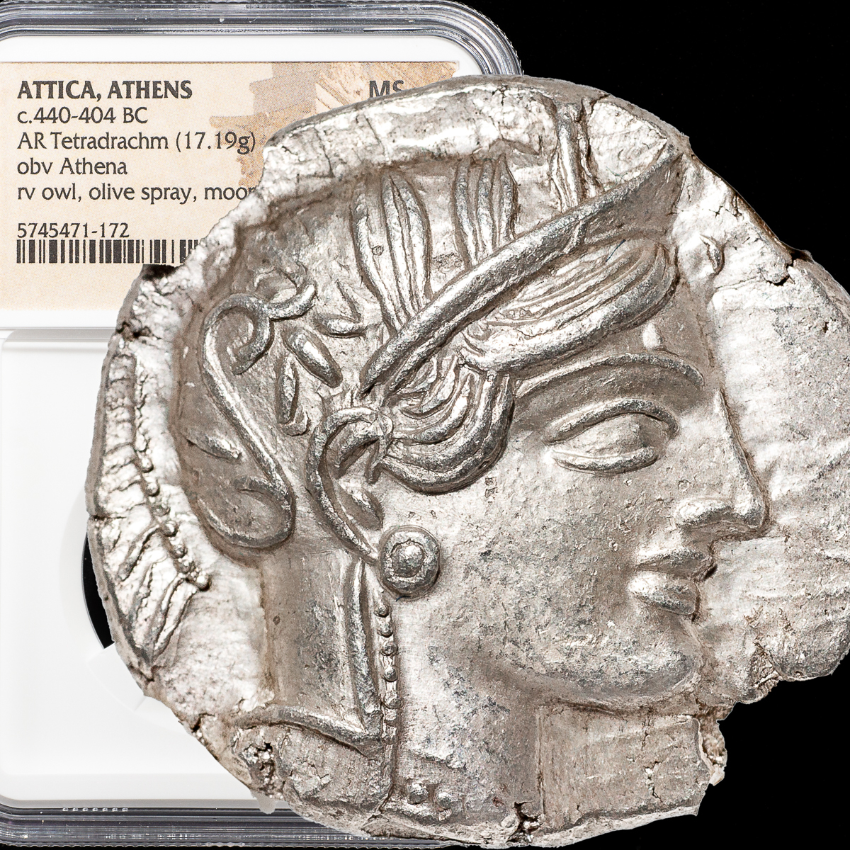 約2400年前、古代ギリシャ時代のアテネにて製造されたテトラドラクマ銀貨です。 古代コインの中でも有名なコインの一つとして知られており、人気、価格ともに上昇の傾向にあります。 表面に『守護神アテナ』、裏面に『知の象徴フクロウ、オリーブの小枝、三日月』が描かれています。 刻印はバランスよく整っており秀逸な出来栄えの個体です。 グレードは未使用MS、Strikeが5点、Surfacが4点と、古代コイン鑑定の最大手NGC社から非常に高い評価を得ています。 もちろん本物と鑑定されており贋作の心配もありません。 一つ一つ手作業で製造された古代コインは刻印の精度などに個体差が大きいです。 古代コインを代表する一枚として、状態の良いものを一つ持っておくのは良い選択肢であると思います。 ご興味がありましたらこの機会をお見逃しのないよう、是非ご検討ください。皆様のご入札をお待ちしております。 ++++++++++++ ・発行国:古代ギリシャ アテネ ・発行年:紀元前440-404年 ・材質:銀 ・重量:17.19 g ・鑑定機関:NGC ・グレード:MS(未使用) ・Strike (打刻状態、位置や刻印の鮮明さなど):5/5 ・Surface (表面状態、艶、傷の有無など):4/5 ・鑑定番号:5745471-172 |