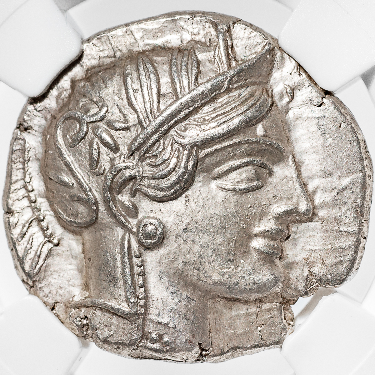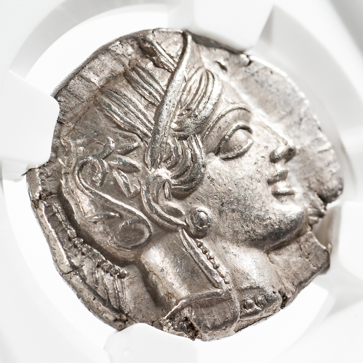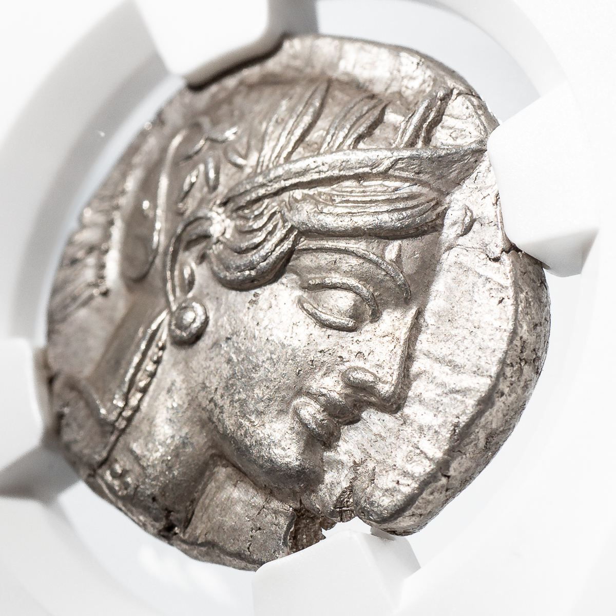 約2400年前、古代ギリシャ時代のアテネにて製造されたテトラドラクマ銀貨です。 古代コインの中でも有名なコインの一つとして知られており、人気、価格ともに上昇の傾向にあります。 表面に『守護神アテナ』、裏面に『知の象徴フクロウ、オリーブの小枝、三日月』が描かれています。 刻印はバランスよく整っており秀逸な出来栄えの個体です。 グレードは未使用MS、Strikeが5点、Surfacが4点と、古代コイン鑑定の最大手NGC社から非常に高い評価を得ています。 もちろん本物と鑑定されており贋作の心配もありません。 一つ一つ手作業で製造された古代コインは刻印の精度などに個体差が大きいです。 古代コインを代表する一枚として、状態の良いものを一つ持っておくのは良い選択肢であると思います。 ご興味がありましたらこの機会をお見逃しのないよう、是非ご検討ください。皆様のご入札をお待ちしております。 ++++++++++++ ・発行国:古代ギリシャ アテネ ・発行年:紀元前440-404年 ・材質:銀 ・重量:17.19 g ・鑑定機関:NGC ・グレード:MS(未使用) ・Strike (打刻状態、位置や刻印の鮮明さなど):5/5 ・Surface (表面状態、艶、傷の有無など):4/5 ・鑑定番号:5745471-172 |