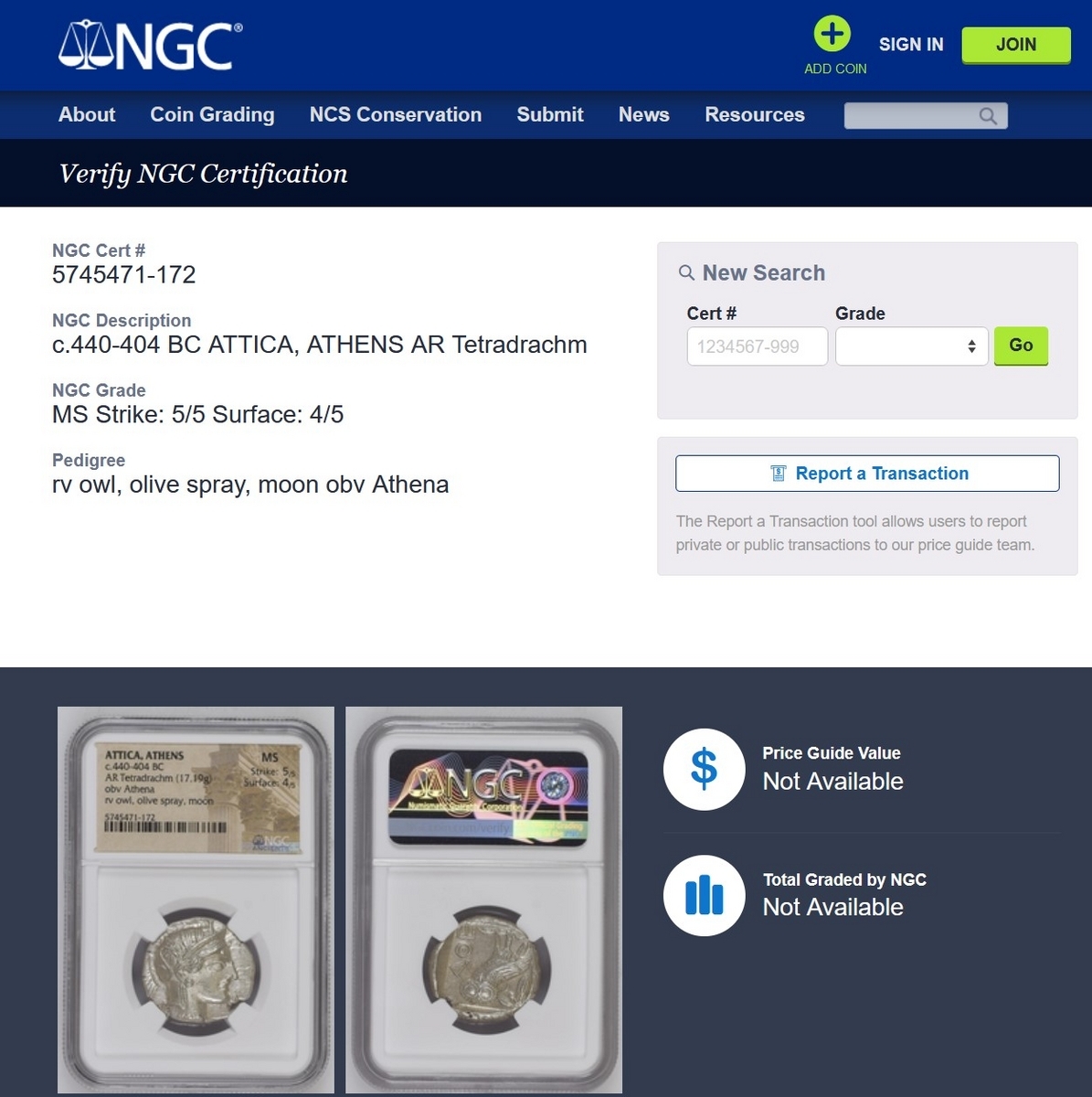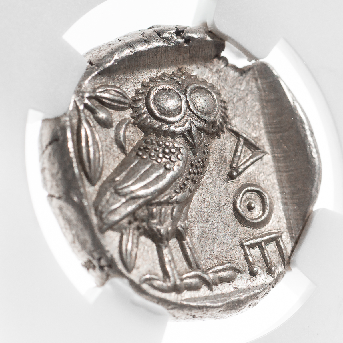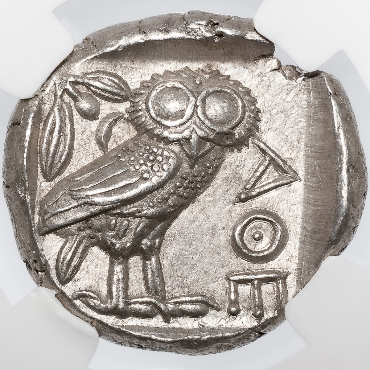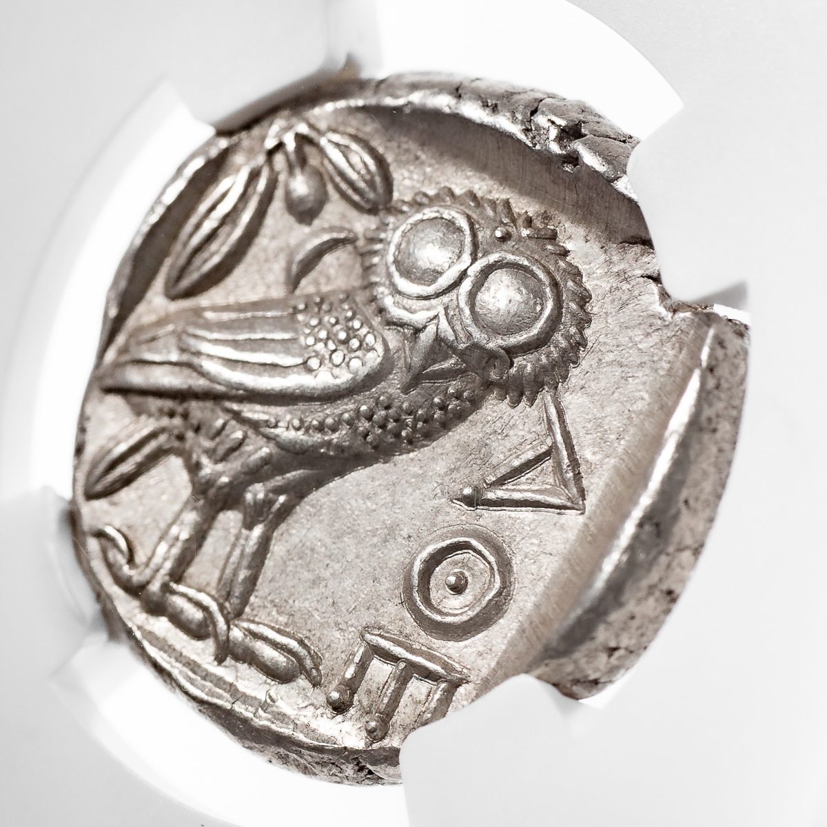 約2400年前、古代ギリシャ時代のアテネにて製造されたテトラドラクマ銀貨です。 古代コインの中でも有名なコインの一つとして知られており、人気、価格ともに上昇の傾向にあります。 表面に『守護神アテナ』、裏面に『知の象徴フクロウ、オリーブの小枝、三日月』が描かれています。 刻印はバランスよく整っており秀逸な出来栄えの個体です。 グレードは未使用MS、Strikeが5点、Surfacが4点と、古代コイン鑑定の最大手NGC社から非常に高い評価を得ています。 もちろん本物と鑑定されており贋作の心配もありません。 一つ一つ手作業で製造された古代コインは刻印の精度などに個体差が大きいです。 古代コインを代表する一枚として、状態の良いものを一つ持っておくのは良い選択肢であると思います。 ご興味がありましたらこの機会をお見逃しのないよう、是非ご検討ください。皆様のご入札をお待ちしております。 ++++++++++++ ・発行国:古代ギリシャ アテネ ・発行年:紀元前440-404年 ・材質:銀 ・重量:17.19 g ・鑑定機関:NGC ・グレード:MS(未使用) ・Strike (打刻状態、位置や刻印の鮮明さなど):5/5 ・Surface (表面状態、艶、傷の有無など):4/5 ・鑑定番号:5745471-172 |