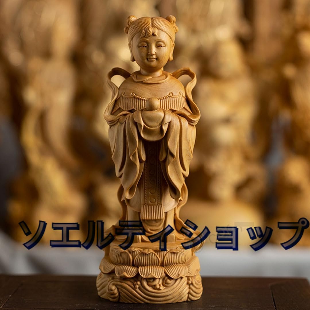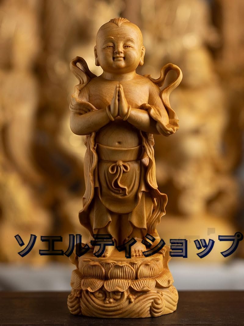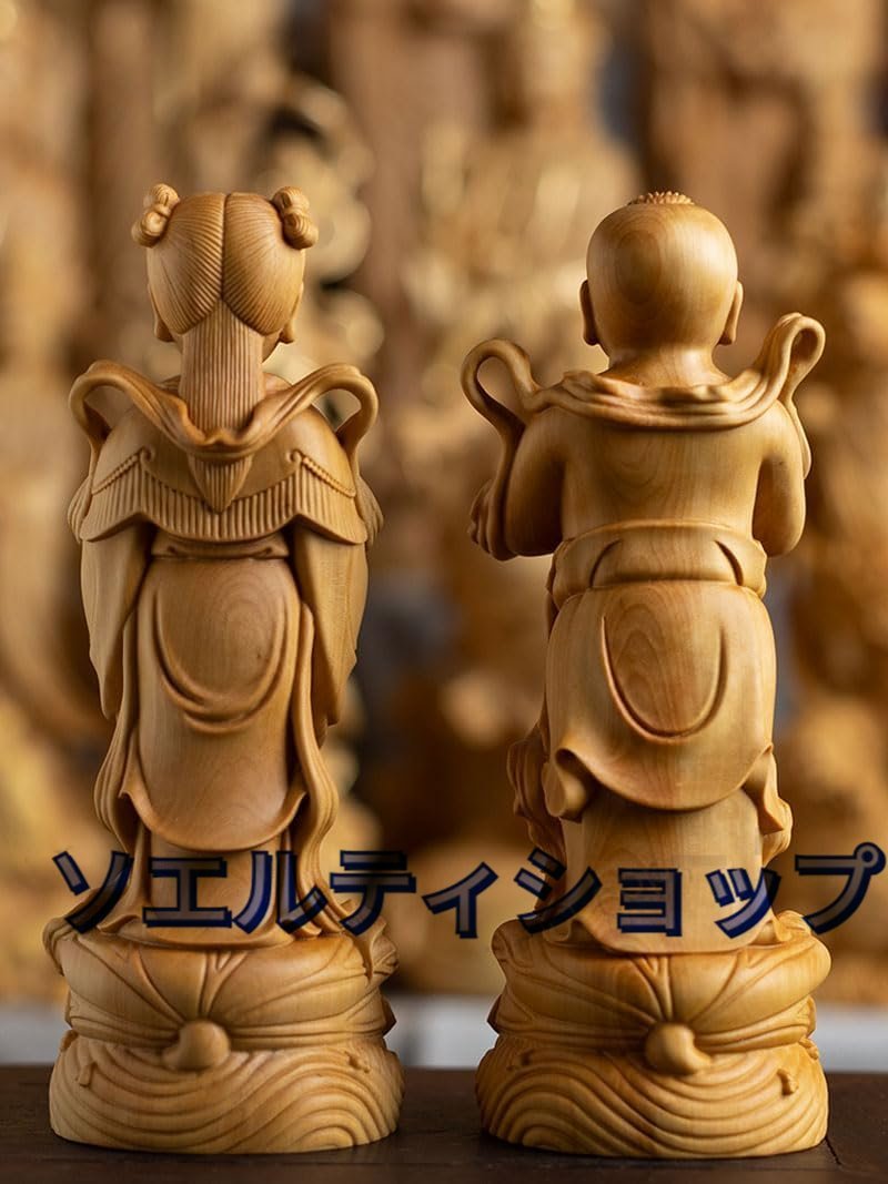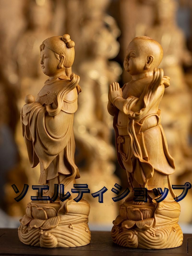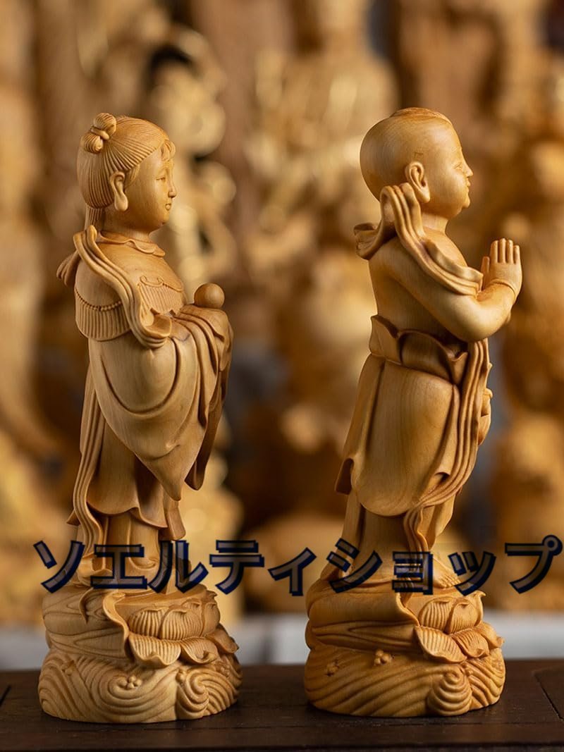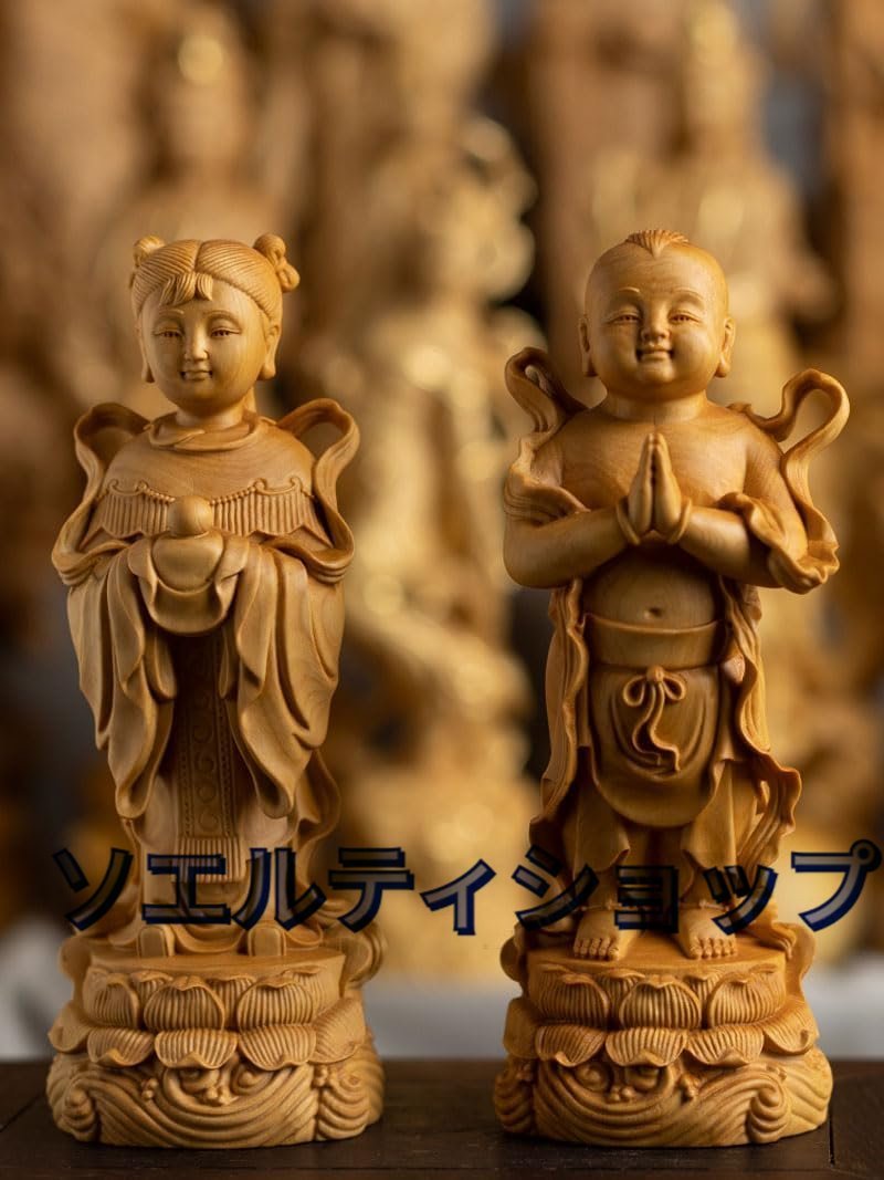 人気推薦★木製仏像 美術品【善財童子 木彫り】2体セット 高級天然ツゲ木彫り 高さ15cm