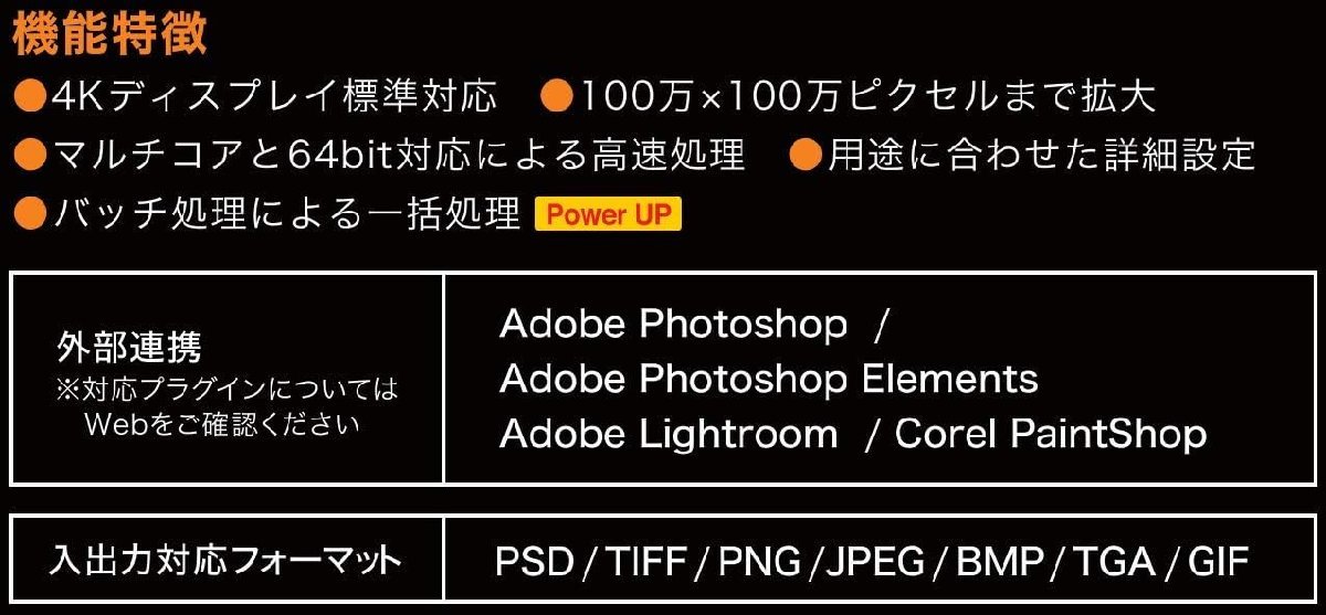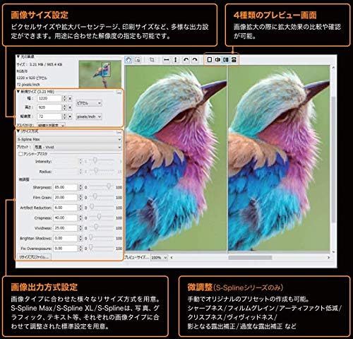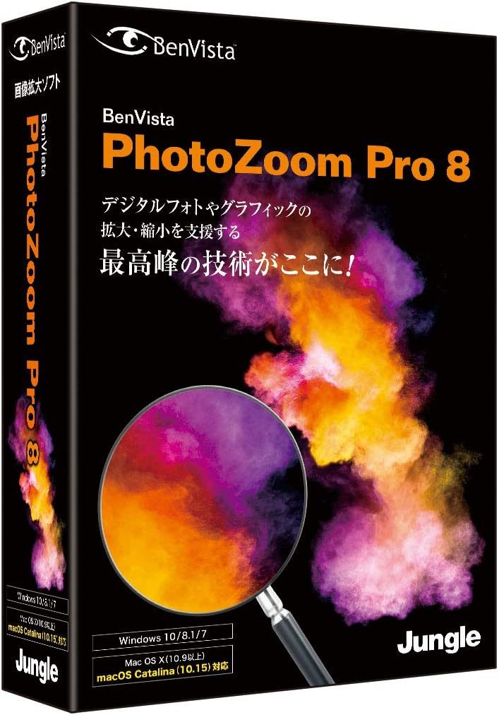 画像データを拡大するとノイズが目立ってしまいます。撮影した写真や画像をきれいに拡大・縮小するためのソフトが「PhotoZoom Pro 8」です。拡大技術「バイキュービック方式」「バイリニア方式」「B-Spline方式」などの既存技術を用いたスムージングはも可能です。独自の拡大技術「S-Spline/ XL/ MAX」で、画像を拡大処理した場合にもよりリアルな質感の表現が可能です。特に、ラインの多い写真や、アニメ、文字を含んだもの等には非常に効果的です。macOSは、最新のCatalinaに対応!●Adobe Lightroom と連携 ●PSDファイル対応 ●高DPI対応(4K対応)●100万×100万ピクセルまで拡大可能 ●マルチコアおよび64bitに対応し、高速処理が可能●元画像の特徴と出力用途に合わせた詳細設定で拡大が可能●各種プラグインに対応:Adobe Photoshop / Adobe Photoshop Elements / Adobe Lightroom / Corel PaintShopご質問は info@activesupport.co.jp までお願いします。