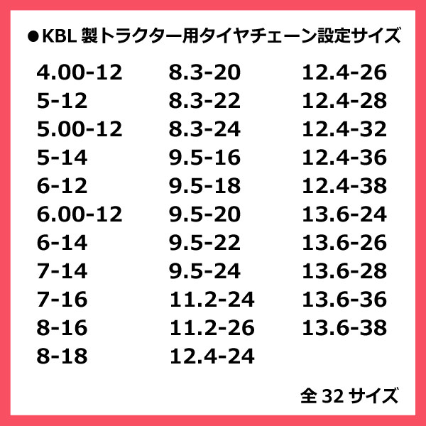 | KBL製トラクター用タイヤチェーン 日本製 AGCH 9.5-18 | |