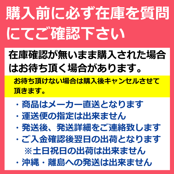 | 発送詳細 | ■送料 無料(北海道・沖縄県・離島を除く) ■発送に関して 決済後、1~2日にて発送させて頂きます。 ※土日祝日の発送はございません。 ※メーカーからの直送になります。 ■運送業者 メーカー直送品は上記以外の運送業者になります。 発送後、「荷物問合せ番号」をご連絡させて頂きます。 ※発送案内が翌日になる場合があります。 |