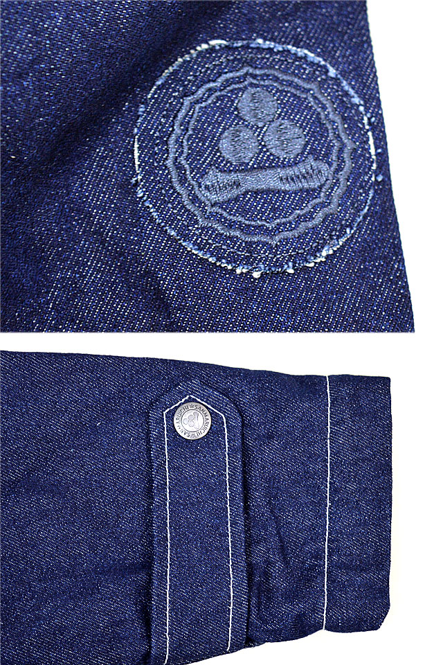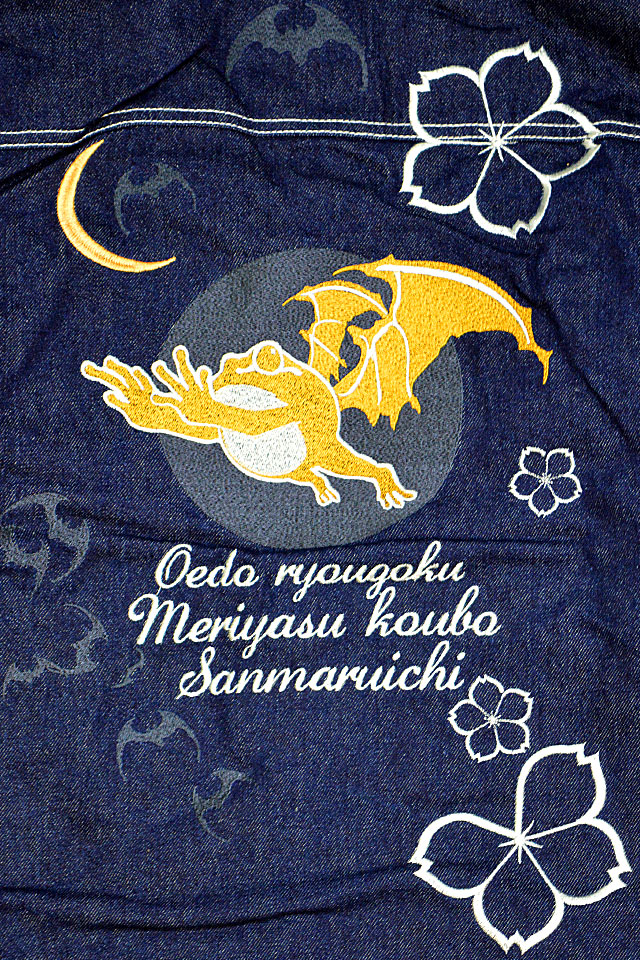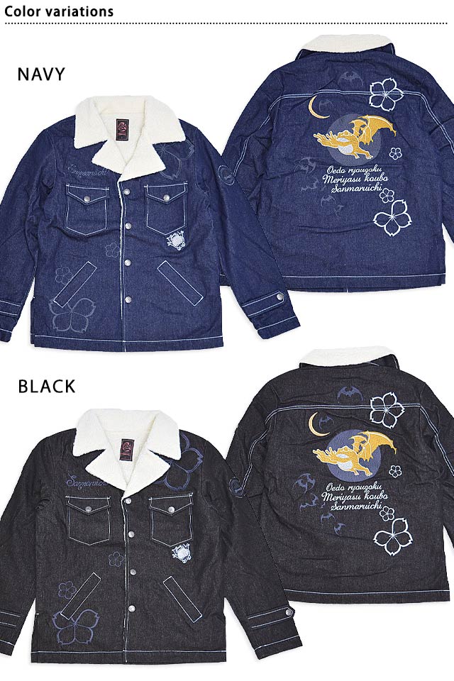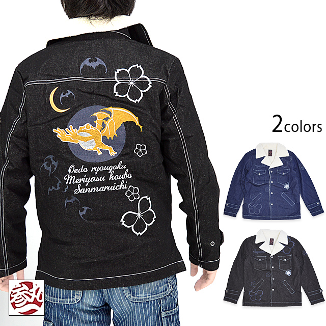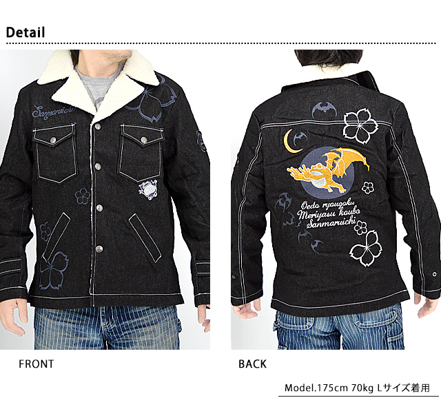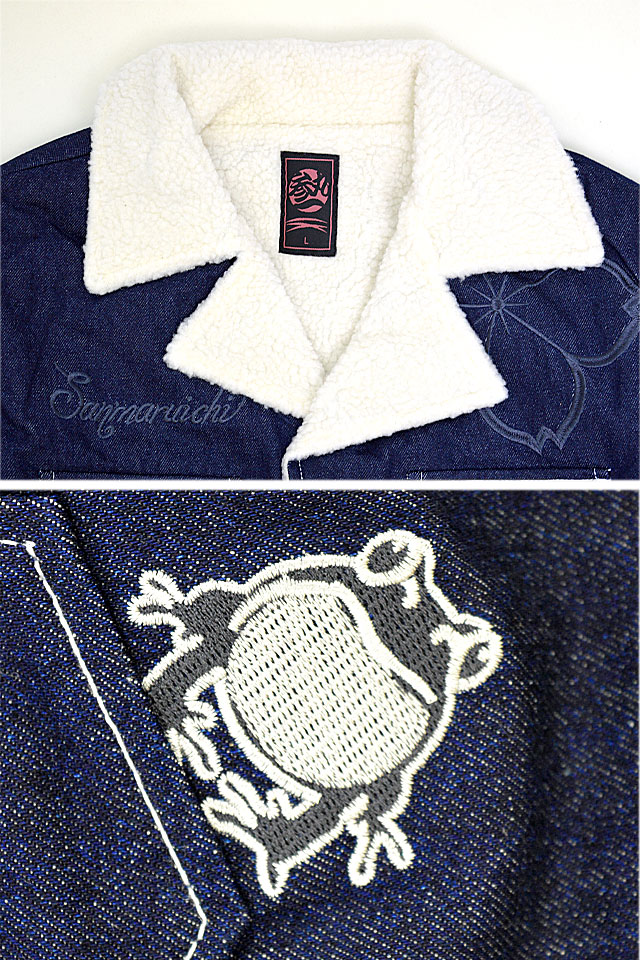 「参丸一」さんから「蝙蝠ボアジャケット(SOP-50037)」のご紹介です。 襟元にボアを切り替えた、寒い季節にぴったりのアウターが登場しました! ボディーにはデニム生地を採用し、カジュアルな仕上がりに。 背中には蝙蝠と蛙を組み合わせた、その名もバットフロッグを刺繍しました。 身頃には大き目の桜の花びらをちりばめました。 フロント右胸にはブランドロゴを刺繍しています。 左袖には家紋をワンポイントで配置。 両胸にはフラップ付きのポケットを、両身頃には斜めポケットをそれぞれ配置。 左のポケットのそばにちょこんと描かれた蛙がポイントになっています。 ボタンにはブランドロゴが刻印されており、細かいところにまで拘り、作りこまれた逸品です。 | |||||||||||||||