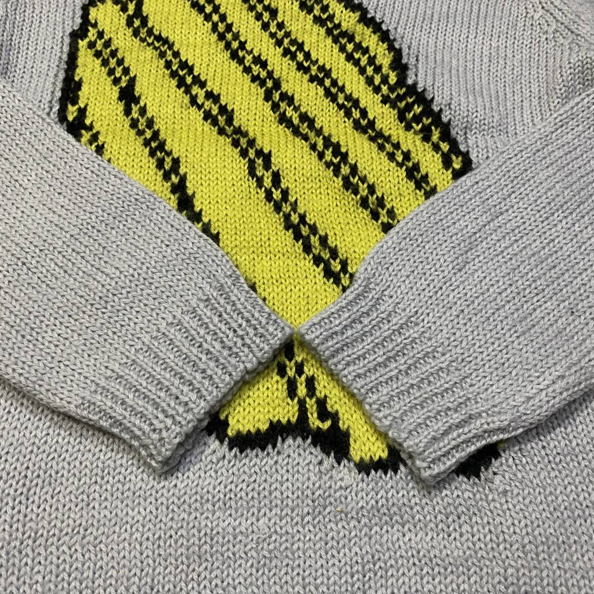フロントにギザギザポテト?の様な得体のしれない柄が編み込まれています。