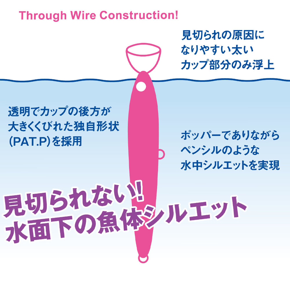 ・透明カップの採用とカップの後方が大きくくびれた独自形状(PAT.P)を採用。水面に浮いた際に見切られの原因になりやすい太いカップ部分を水上に出し、ポッパーでありながらダイビングペンシルと同じような水中のシルエット を実現しました。