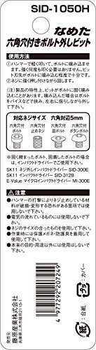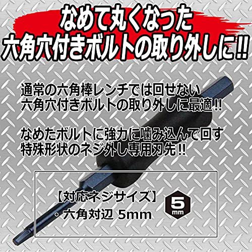 ・ 六角対辺5mm SID-1050H・・Size:六角対辺5mm・用途:なめて丸くなった六角穴付きボルトの取り外し・特徴1:通常の六角棒レンチで回せない六角穴付きボルトを回せるビット・特徴2:特殊刃形状がなめたボルトに強力に噛み込んで回す・対応サイズ:六角対辺5mm・入数:1個説明 通常の六角棒レンチで回せない六角穴付きボルトを回せるビット 【用途】 なめて丸くなった六角穴付きボルトの取り外し 【特徴】 ・特殊刃形状がなめたボルトに強力に噛み込んで回す 【注意事項】 ※ハンマーの打撃によりネジ止めしている材料が破損・変形する恐れがある箇所では使用しないで下さい。 ※電気の流れているものには使用しないで下さい。 ※ネジのサイズの合ったものを使用して下さい。 ※作業時には保護メガネ・防護具を着用して使用して下さい。 ※本来の目的・用途以外には使用はしないで下さい。