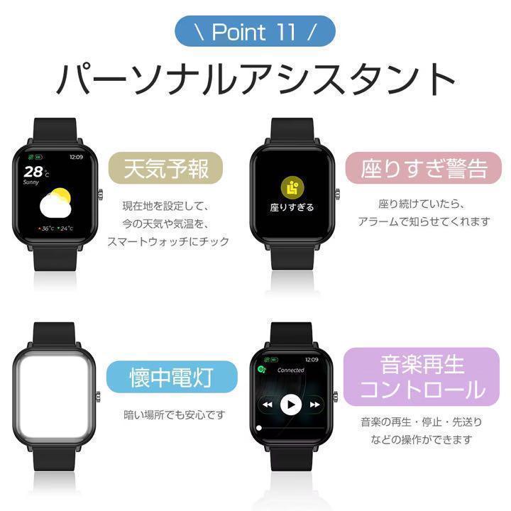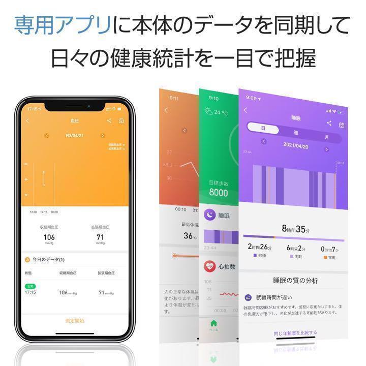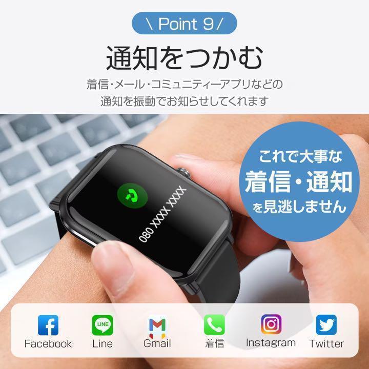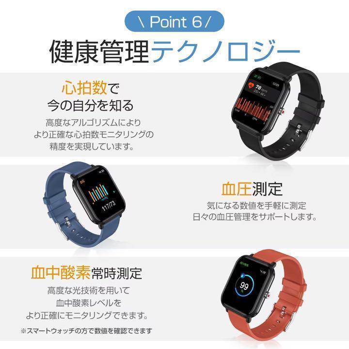体表面温度検知、血中酸素測定、活動量、歩数記録、睡眠記録、天気報告、SMS通知、電話の着信通知、アラーム、データ同期、データ分析。時計機能はもちろん、iPhoneやAndroidなどのスマホとBluetoothで接続することで、走行距離、カロリー消費、睡眠モニター など日々の様々な活動量の計測が可能です。