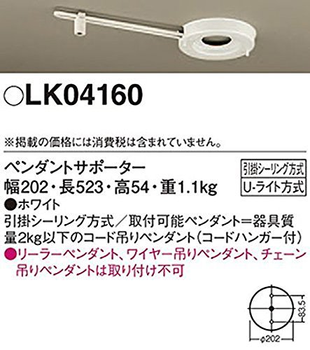 ・ホワイト LK04160・引掛シーリング方式・W202・H54・色:ホワイト・梱包サイズ:57.2 x 25.2 x 6.9 cm●ペンダントの位置を上手に調節でき、テーブルの中心まで動かすことができる。 ●天井が傷つかない。 ●取付可能ペンダント=器具質量2kg以下のコード吊りペンダント(コードハンガー付)。 ※リーラーペンダント、ワイヤー吊りペンダント、チェーン吊りペンダントは取付できません。