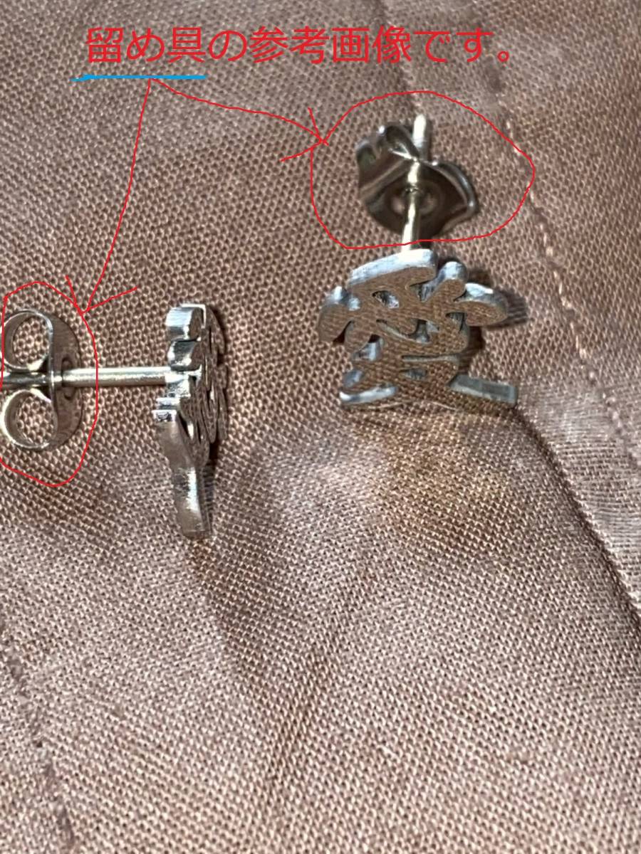 商品サイズ | フェイス部の大きさは、約8.6×9,8ミリです。針(シャフト)の長さは約10ミリ。 左右1対です。2つです。 ステンレス製です。 留め具(キャッチ)2つ付きです。留め具も銀色です。 |