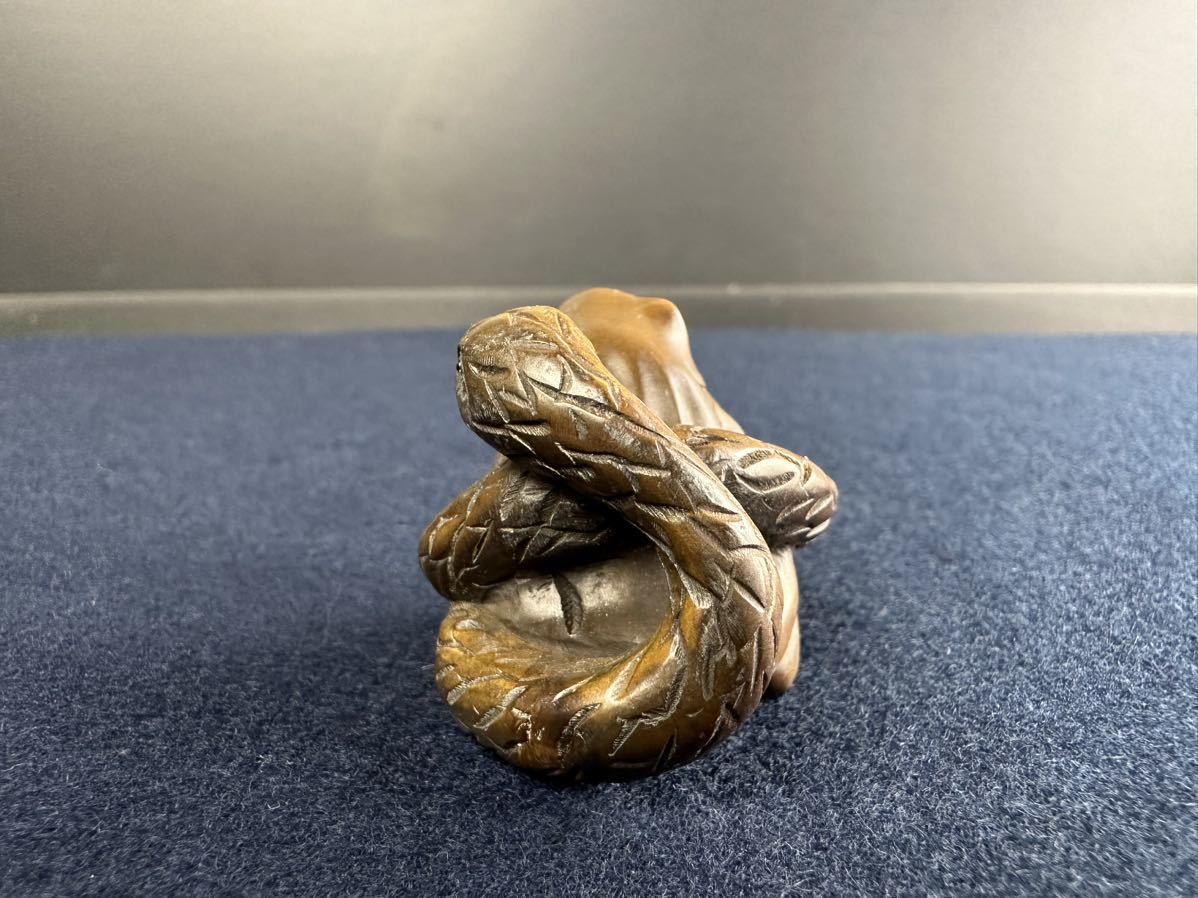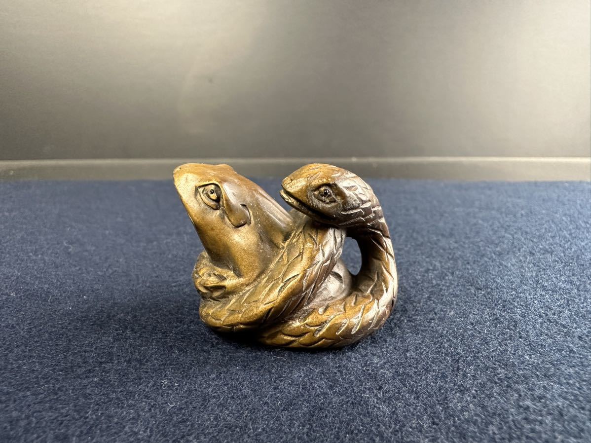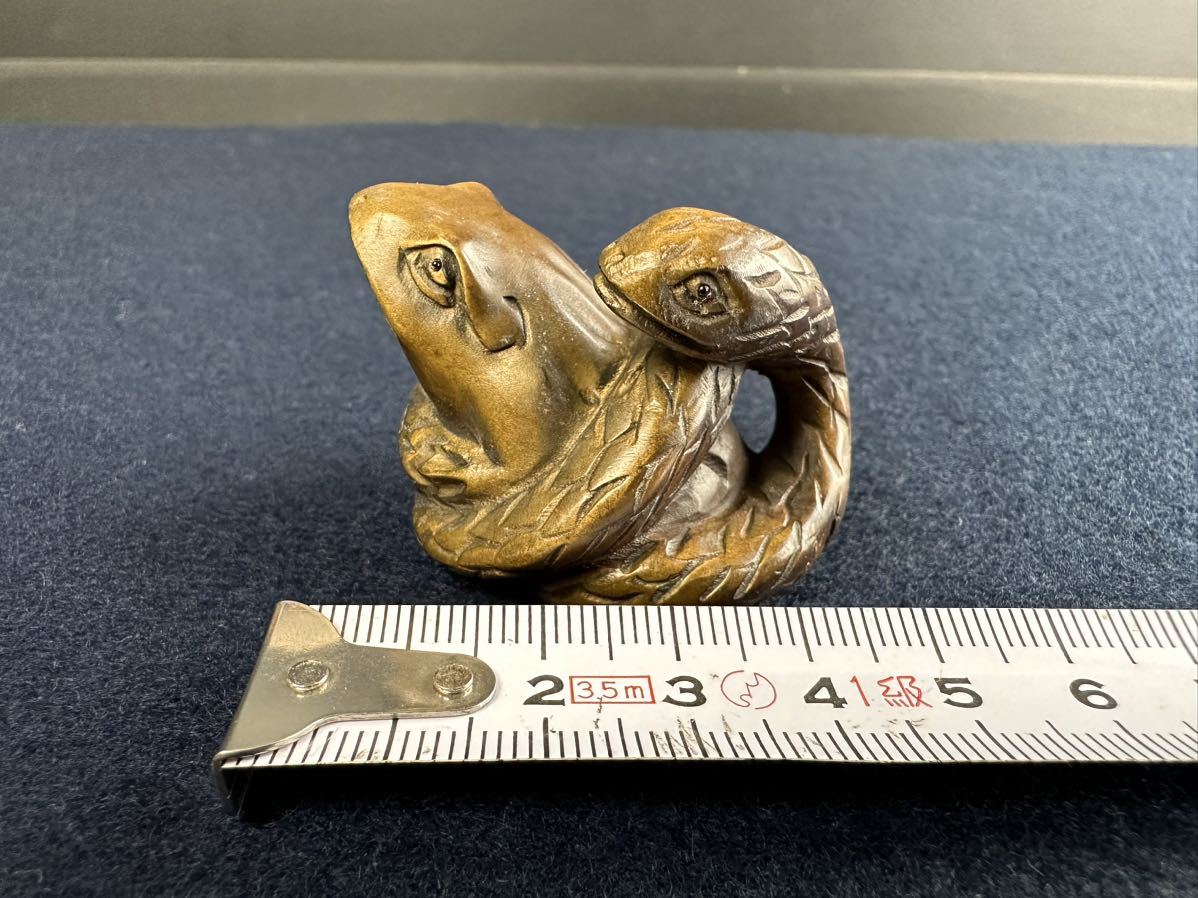 [HG782] 木製 根付 蛇 蛙 細密彫刻 提げ物 煙草入れ 木彫 拓植 ヘビ カエル 爬虫類