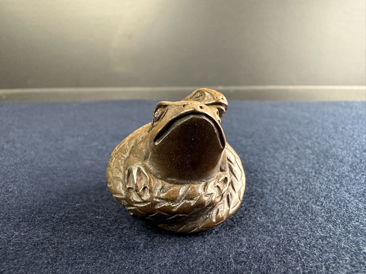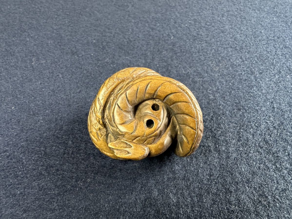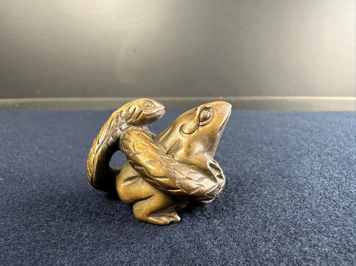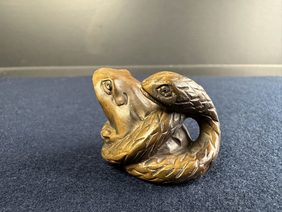 [HG782] 木製 根付 蛇 蛙 細密彫刻 提げ物 煙草入れ 木彫 拓植 ヘビ カエル 爬虫類