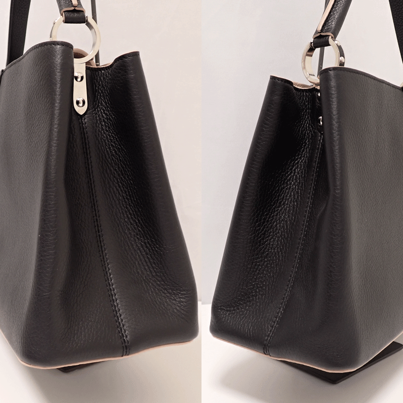 素材 トリヨンレザー お色は黒かと思われますが光の加減で限りなく黒に近い濃紺にも見えます(内側はピンク)