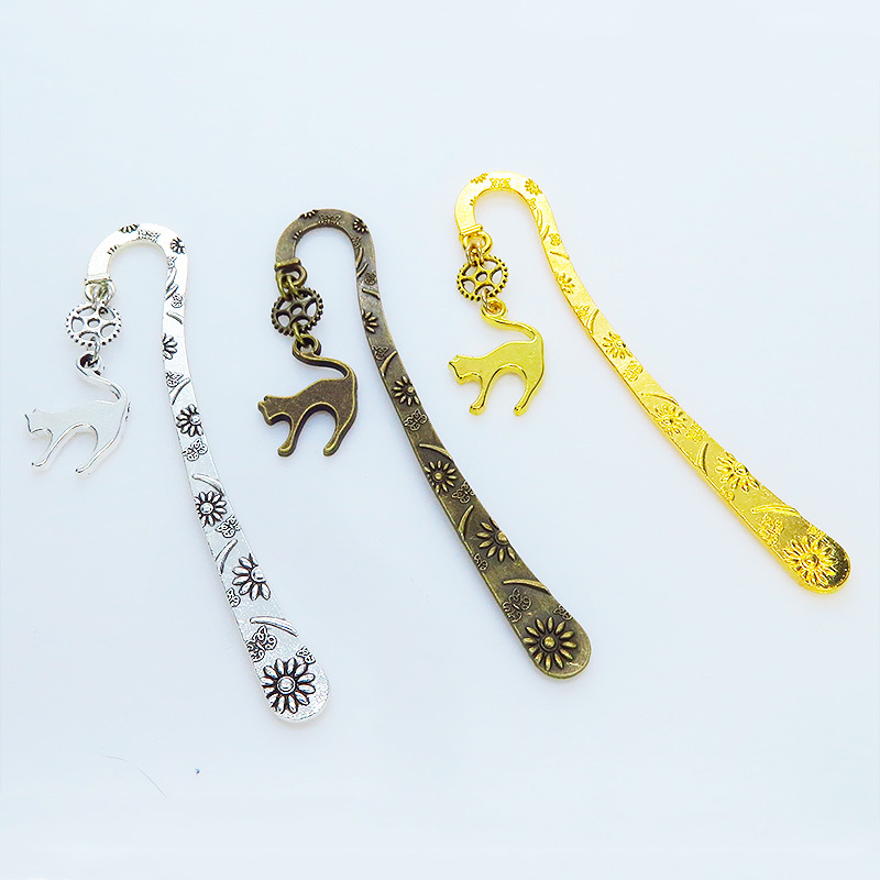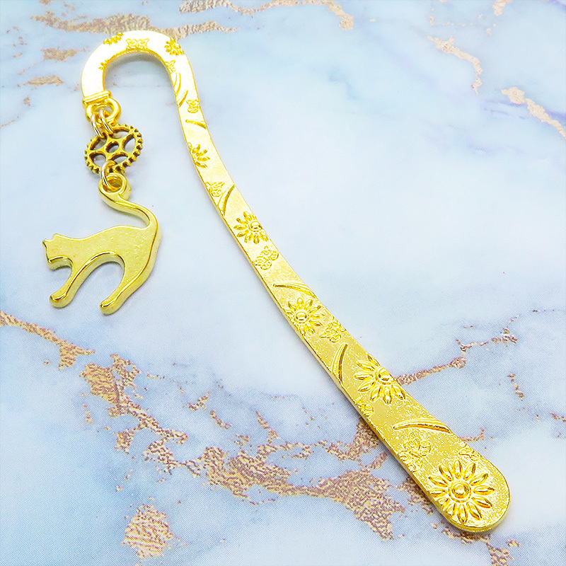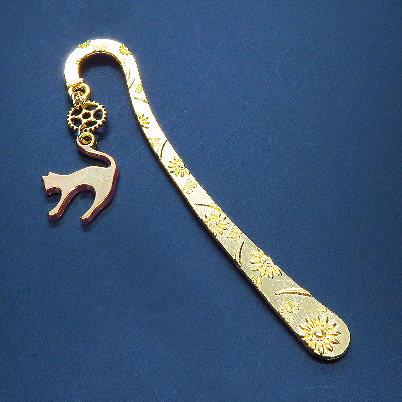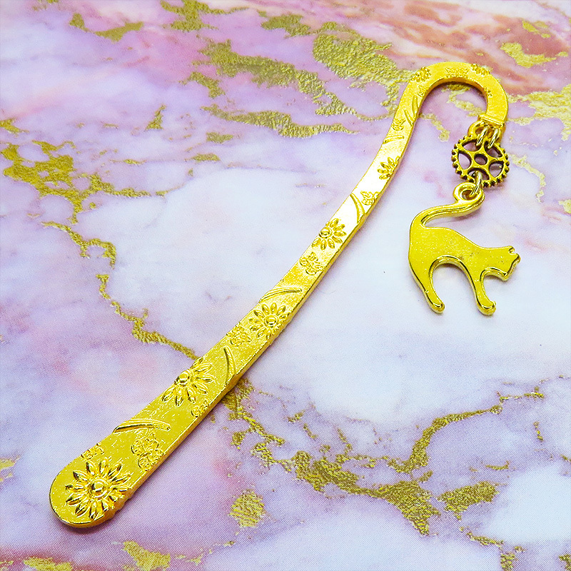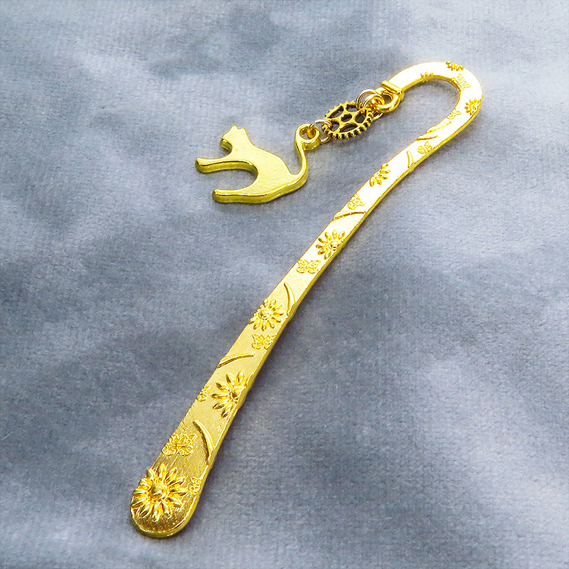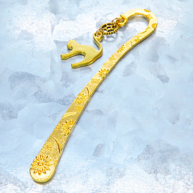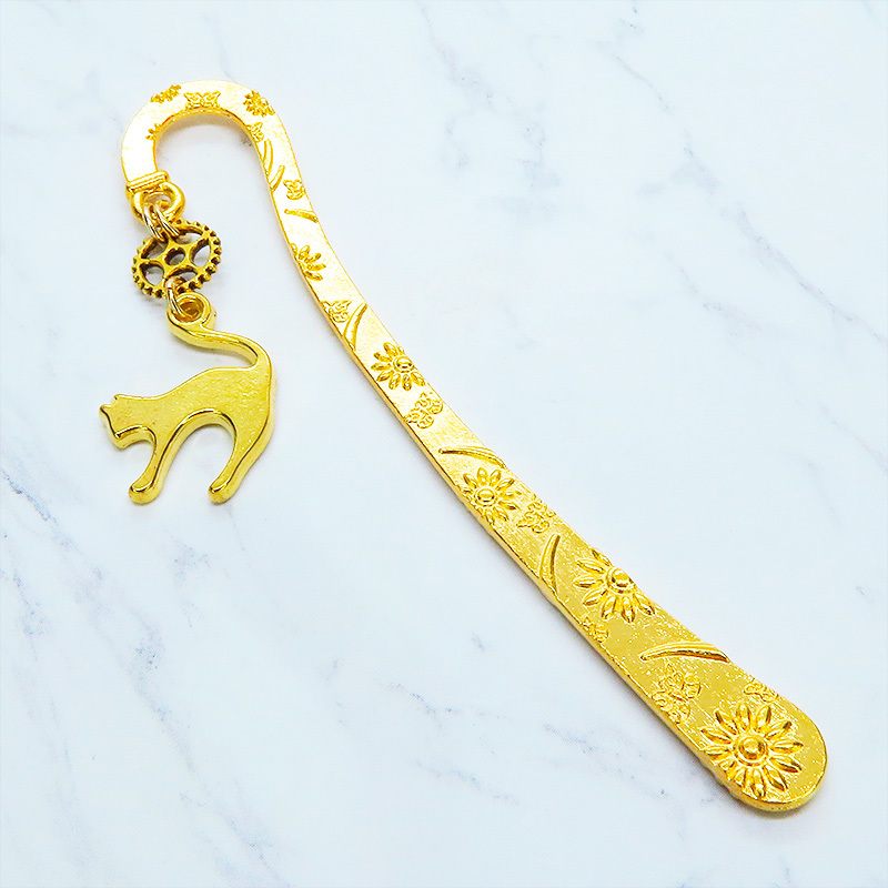 ゴールドカラー 跳ね猫と小さな歯車を組合せた大人可愛いブックマーカー 栞 しおり 花柄模様