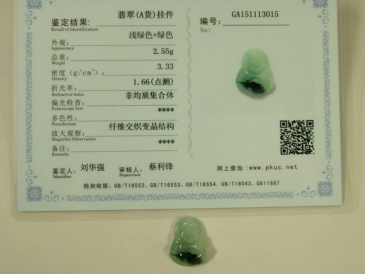 | ★商品説明★ | サイズ:高19×16×厚5mm 重さ:2.5g 【材質】天然翡翠(ジェイダイト、硬玉)・俗称「翡翠A貨」・完全無処理翡翠。 濃緑色が綺麗なミャンマー翡翠。こちらは色・艶・彫り全て良いA貨と呼ばれるランクの物です。彫られているのは、開運と、良縁・子宝の神、布袋様です。コレクションやお守りに。上部に貫通穴が有るのでペンダントトップや下げ飾りにもなります。 ◎北京大学宝石鑑定センターの鑑定証付き。 |