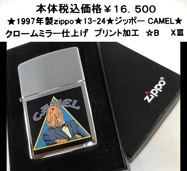 現物を写真撮影、この商品が届きます。1997年製新品未使用 ☆B XIII ボトム/インサイド共に同年同月のパーフェクトバージョンです。クロームミラーベースに人間の洋服を着てタバコを咥えたキャメル絵柄加工です。裏面はサテーナ(擦り)加工です。新品未使用無傷のベスト品。既に廃版になっており今後の入手困難品です。ビンゴが出品している全ての商品は、店頭販売、オークション販売、ショッピング販売等重複し販売しております。時間差で売れ切れや、出荷点検検等で傷が付いていたり破損している事もあります。従いまして、お買い上げ頂きましても出荷出来ない場合も有りますので、予めご了承の上お買い求め下さい。ご注文商品は他商品と同梱配送出来ますので、何個ご注文されても送料は1口分です。1.レターパック発送 ¥520 日時指定不可。(郵便レターパック)。2.宅配便発送税込み ¥880日時指定必須(沖縄/離島は別途価格)。必ず 受取日時 をご指定下さい。(例:15日 18~20 時必着)再配達防止の為。 (業者は当社にお任せ)。3.代金引換発送引手数料税込み ¥1、210 日時指定必須(沖縄/離島は別途価格)。 必ず 受取日時 をご指定下さい。(例:15日 18~20 時必着)再配達防止の為。(業者は当社にお任せ)。