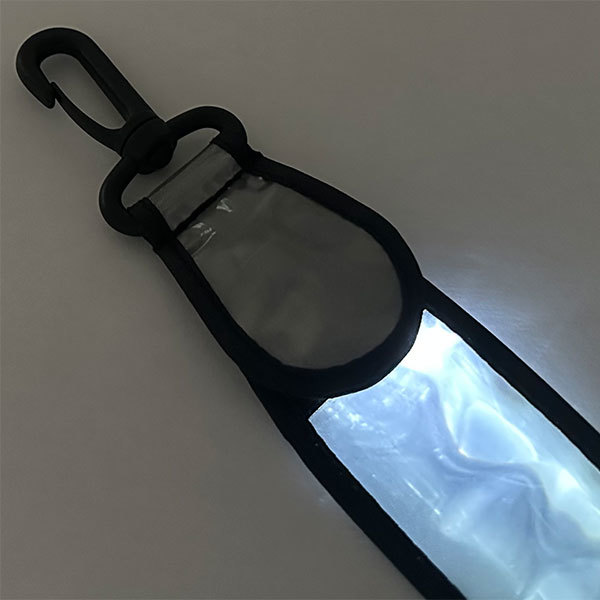 フック付き、カバンやベルトなど掛けられるところならどこでも使えます。