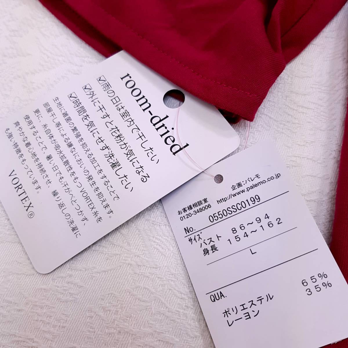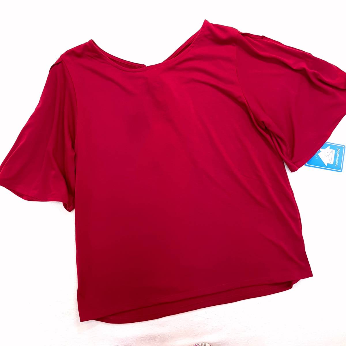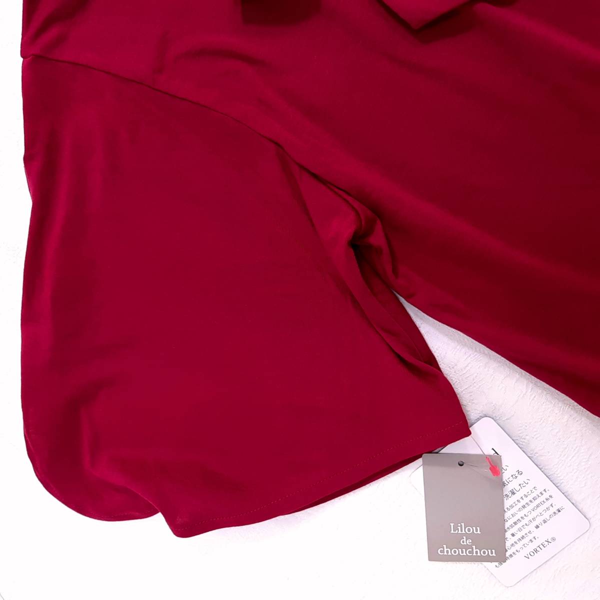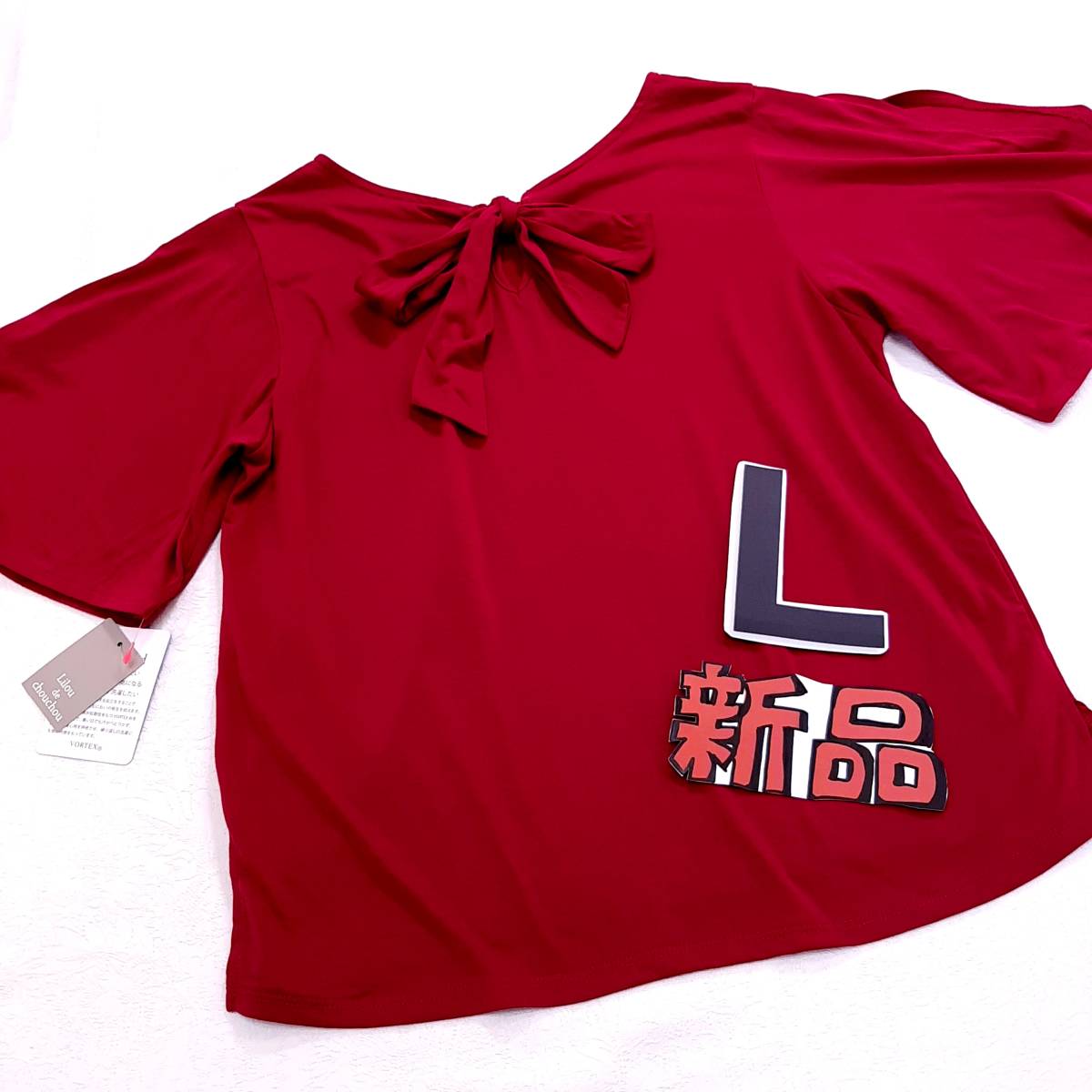 f6★新品★吸汗速乾 防臭/静菌加工 リボン付き フレアー袖 着痩せデザインカットソー Tシャツ★ストレッチ レッド赤色 レディースLサイズ