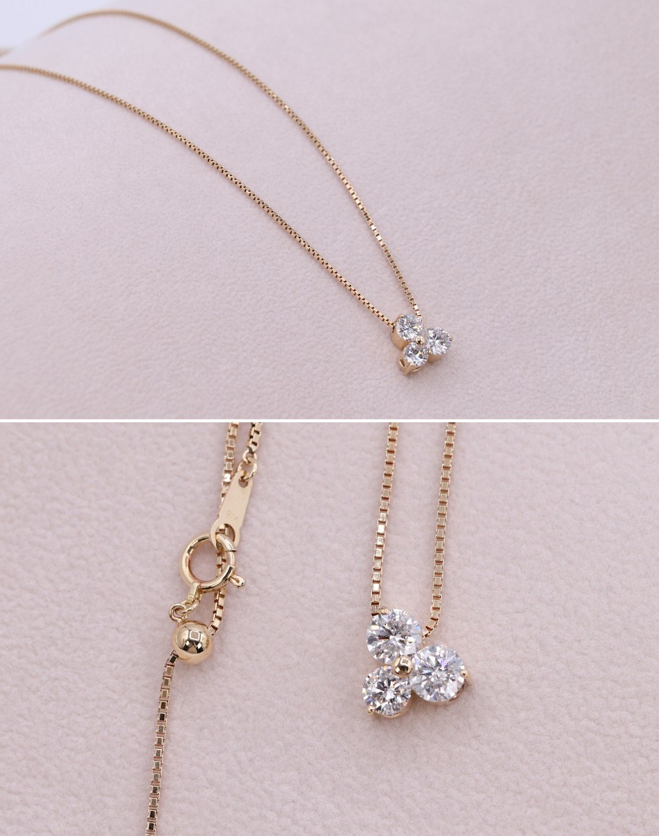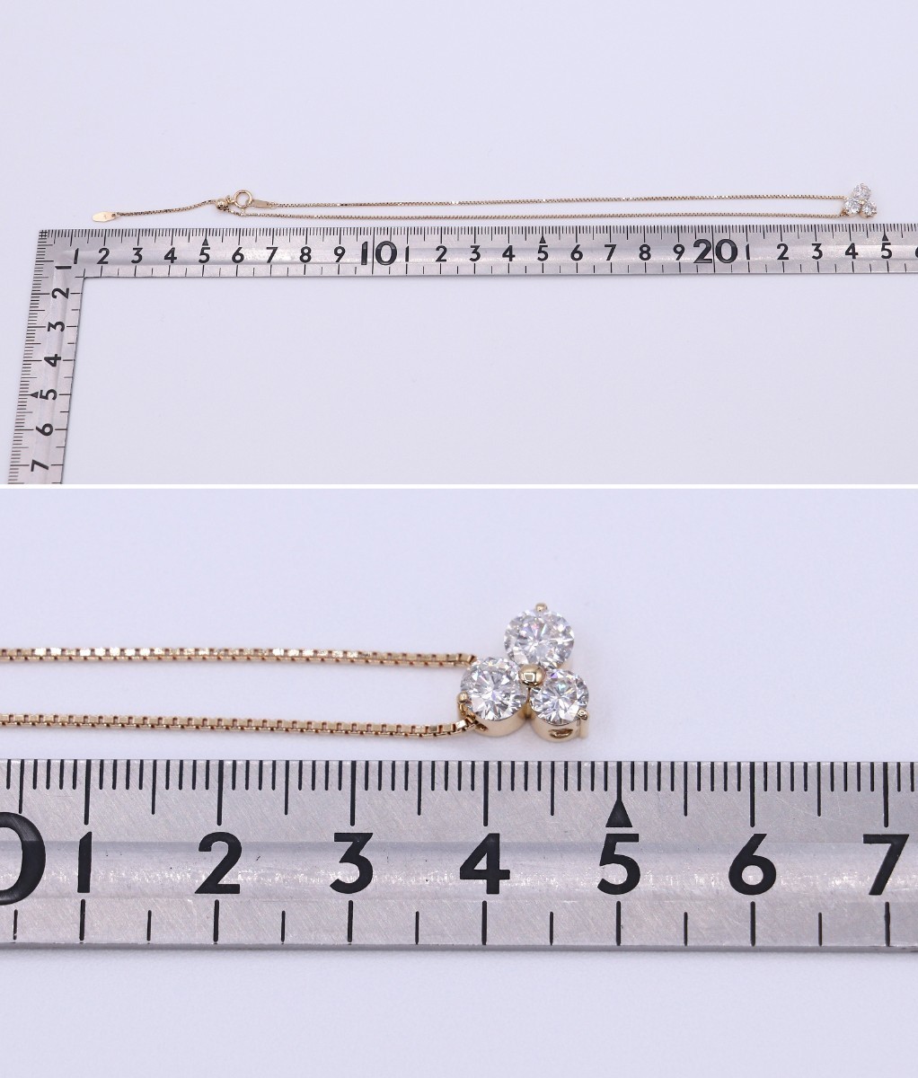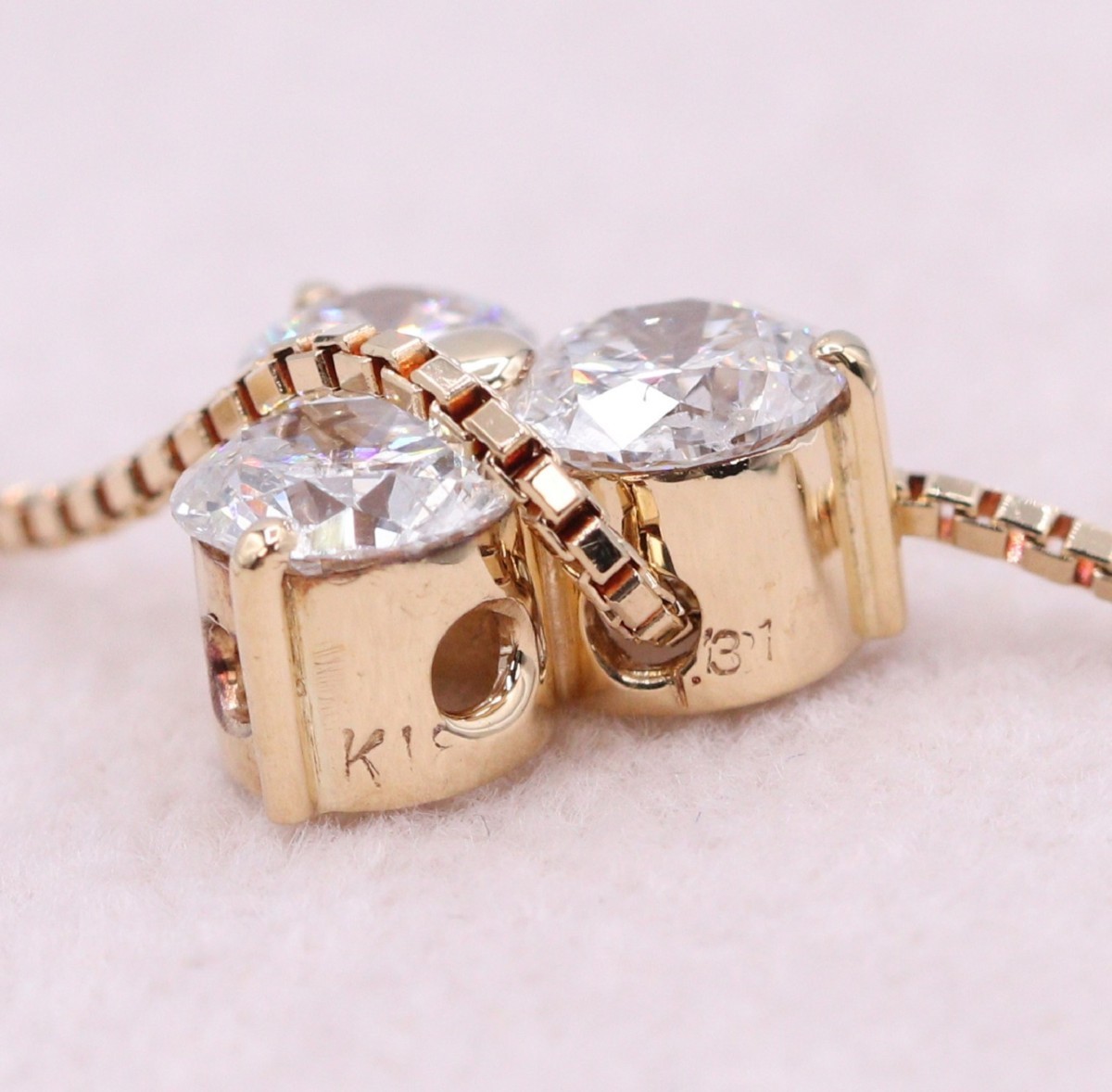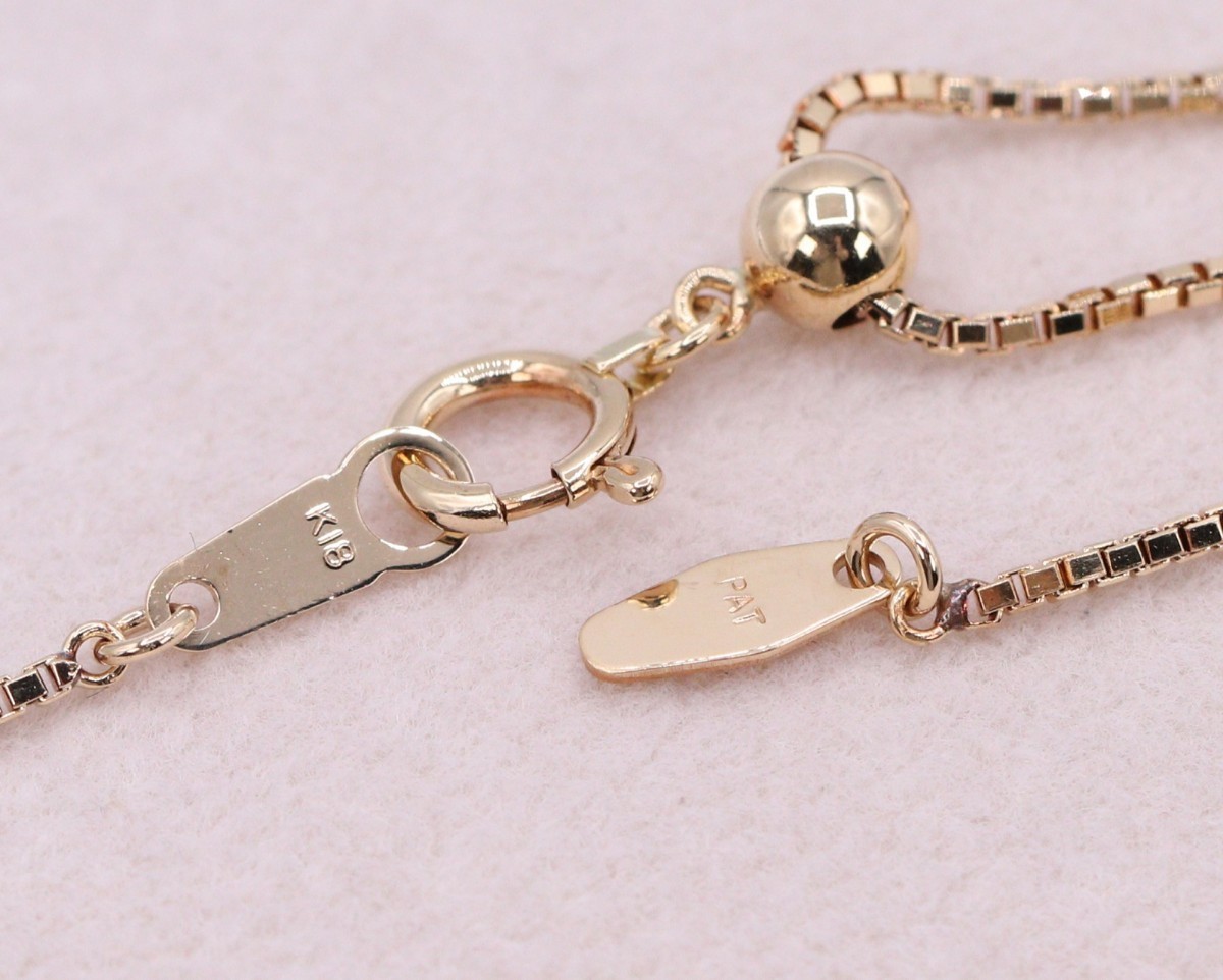 無色透明クリアな煌めきのダイヤモンドが総1.31ctセットされたゴージャスなデザイン。K18製ベネチアンチェーンが使用された一体型となっております。キラキラとした面に細身ながら強度を兼ね備えたチェーンです。スライド式で装いに合わせて調節が可能でございます。