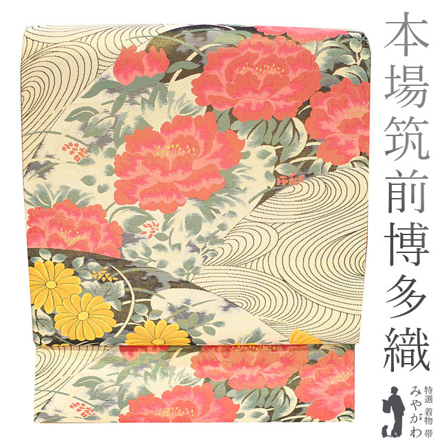 袋帯 本場筑前博多織 金通し 金糸 金ベージュ 牡丹 菊 流水 艶やかな織り 正絹 絹 フォーマル 新古品 仕立て上がり みやがわ sb51083