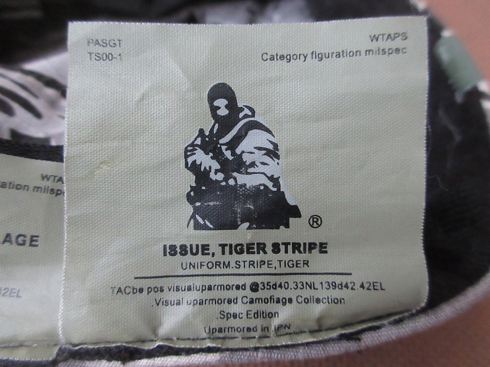 1993年に、東京で、かつて下北沢に存在した伝説のスケート・ショップ「VIOLENT GRIND(バイオレントグラインド)」の元店員、夜ジャズシリーズ等で知られる、レコード番長「須永辰緒(Tatsuo Sunaga/DJ DOC HOLIDAY/ドク・ホリデイ)」氏、「MASAMI(牧野雅己/Masami Makino)」氏等との伝説のHIP HOPユニット(ラップグループ)「SPANK 4(スパンク4/スパンク・フォー)」のラッパー、「GOODENOUGH(グッドイナフ/GE)」、「A BATHING APE(アベイシングエイプ/BAPE)」、「UNDERCOVER(アンダーカバー/UC)」、「ARTDEVIL(アートデビル)」、「TEE-19(T-19/T19 skateboards/TEE NINETEEN/ティーナインティーン・スケートボード)」をはじめとしたブランド、「Cornelius(コーネリアス(小山田圭吾/Keigo Oyamada)氏」、「スチャダラパー(SDP/SCHA DARA PARR)」、「TOKYO No.1 SOUL SET(トーキョーナンバーワンソウルセット)」をはじめとしたアーティストへのグラフィック、ロゴ、イラスト提供等の活動でも知られ、現在は、2011年に、元「Mo'Wax(モワックス)」、「BILLIONAIRE BOYS CLUB(BBC/ビリオネア・ボーイズ・クラブ)」での活動で知られる「Toby Feltwell(トビー・フェルトウェル)」氏、「菱山豊(Yutaka Hishiyama)」氏と共に設立した、ブランド名に、アメリカの作家「Philip K Dick(フィリップ・K・ディック)」氏の著書「Ubik(ユービック)」 に登場する女性のタトゥー、ラテン語で「Caveat Emptor(買い手が責任を持つ)」を掲げるウェア・ブランド「C.E(シーイー/CAV EMPT)」を手掛ける、どこの枠組みにも属さず、消費する事ができない、東京が誇る本当の意味でのオリジネーター「SKATETHING(スケートシング/スケシン/SK8THING)」氏と、かつて存在した「PHILOSOPHY STORE(フィロソフィー・ストア)」、「PHILOSOPHY ZINE(フィロソフィー・ジン)」、2011年に、東京都渋谷区神南(ファイヤー通り)にオープン(2020年に閉店した)「GIP-STORE(ジーアイピー・ストア(ゲリラの潜伏場所/GUERRILLA THE INCUBATION PERIOD)」、2015年に、妻である「西山美希子(Mikiko Nishiyama)」さんと設立した「DESCENDANT(ディセンダント)」での活動でも知られる、「西山徹(Tetsu Nishiyama)a.k.a.TET」氏によって設立された、伝説のウェア・ブランド「FORTY PERCENTS AGAINST RIGHTS(フォーティーパーセント アゲインストライツ/FPAR/40%/FORTEE)」が、1996年に、「西山徹(Tetsu Nishiyama)a.k.a.TET」氏によって再始動する際に変名された、ブランド名に「二度殺す」の意味を持つウェア・ブランド、〔WTAPS(ダブルタップス/WTVUA)〕の、一部を除くキャップの生地に、1950年代後期頃に「ベトナム共和国(南ベトナム/Republic of South Vietnam)海兵隊」に採用され、「虎の皮(da cp/ジャーコプ)」、「縞柄(sc ran/ソク ラン)」と呼ばれるカモフラージュ柄(迷彩柄/Camouflage/Camo)として知られる「タイガーカモ(タイガーカモフラージュ/tiger camo/タイガーストライプ/TIGER STRIPE/Tigerstripe)」柄の生地を使用し、キャップフロント部に「ROGUE SQUAD WTAPS EMPIRES SERVICES」の階級章タイプのパッチ、キャップ左サイド(左耳側)付近に「CategoryFiguration/WTAPS」のピスネーム、キャップインナー部に「PASGT TS00-1 WTAPS Category figuration milspec EDITION, PATTERNS, CAMOUFLAGE COTTON,RIPSTOP,ALL WEATHER, TACbe pos visualuparmored@35d40.33NL139d42.42EL .Visual uparmored Camoflage Collection .Spec Edition Uparmored in JPN」のタグ、「PASGT TS00-1 WTAPS Category figuration milspec 「兵士(ソルジャー/soldier/「SKATETHING(スケートシング/スケシン/SK8THING)」氏デザイン)」のイラスト (R) ISSUE,TIGER STRIPE UNIFORM.STRIPE,TIGER TACbe pos visualuparmored@35d40.33NL139d42.42EL .Visual uparmored Camoflage Collection .Spec Edition Uparmored in JPN」のタグが施された、日本製〔オールド(Old/Vintage/ヴィンテージ/当時物)・タイガーカモ柄(TIGER STRIPE)・リップストップコットン(RIPSTOP COTTON)・コンバットキャップ(Combat Cap)〕になります。