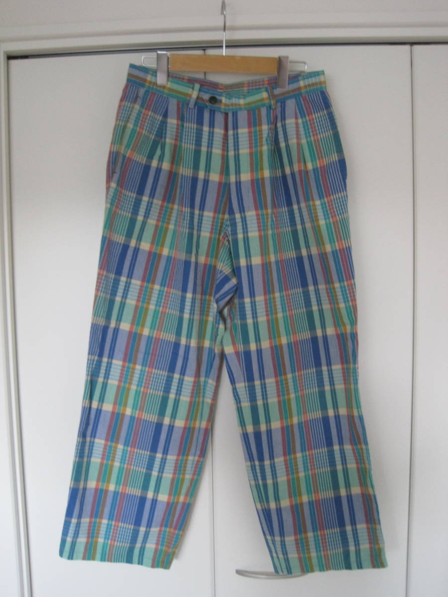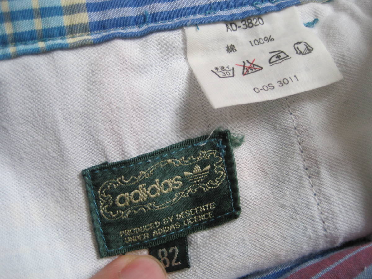レア デサント製 アディダス チェックワイドパンツ スラックス 2タックになります。古いもので着用感がありますが、特に目立つ傷、汚れはありません。サイズは82、綿100%、日本製です。ウエストは38cm、股下66cm、モモ幅31cm(股下10cmで)、スソ幅23.5cmです。素人の採寸ですので若干の誤差、商品状態はご了承ください。 落札後は、ノークレーム、ノーリターン、ノーキャンセルでお願いします。 発送方法はレターパックです。ほかにも色々出品していますので良かったらご覧ください。
