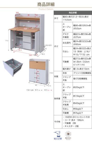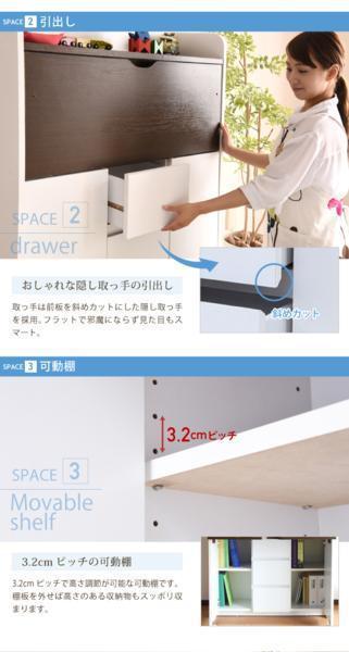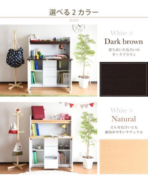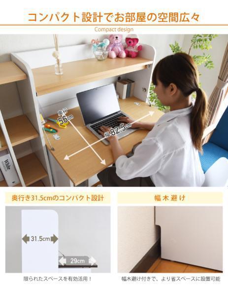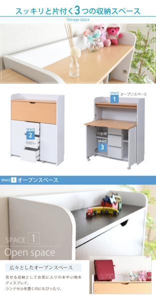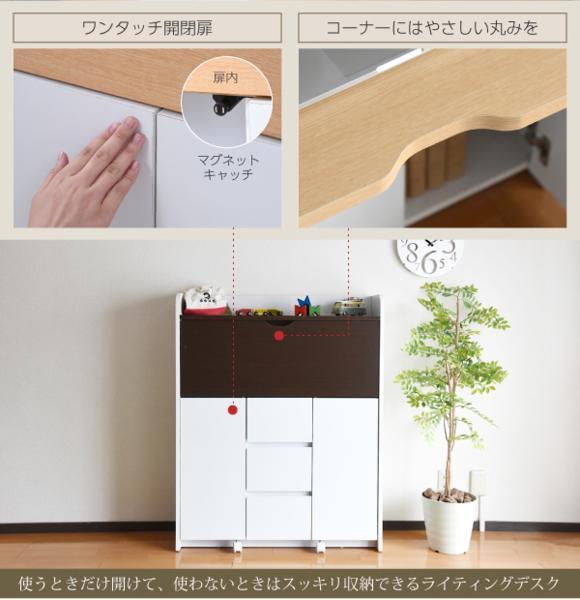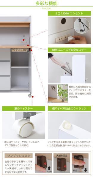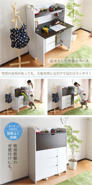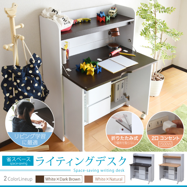折り畳み式天板で、使いたいときだけ広げて、使わない時はすっきり畳んでおける、ライティングデスク。しかも薄型だからリビングに最適。リビングでの子供の学習から、ママやパパのパソコンデスクとしても。上部にはランドセルなどを置けるオープン収納部、下部には扉収納部と3段の引出しで、収納力にも自信あり。コンセント、配線コード穴もあるので、PC、周辺機器の設置もOKです。 | |||||